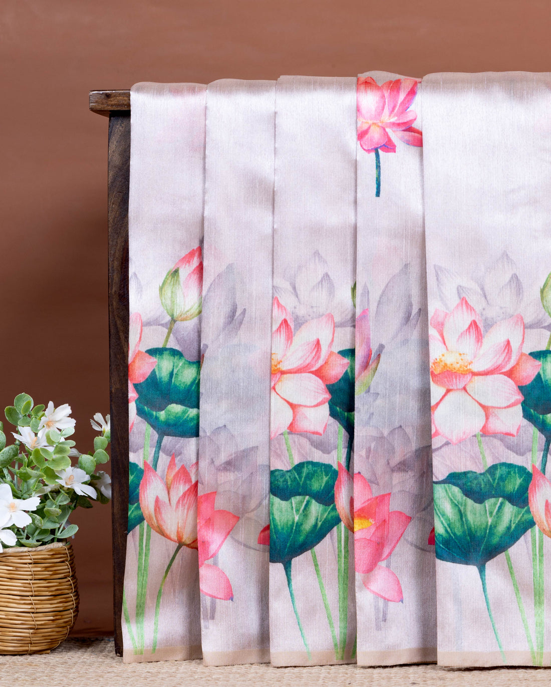 Printed Linen Cotton Saree with Floral Design - Sandal