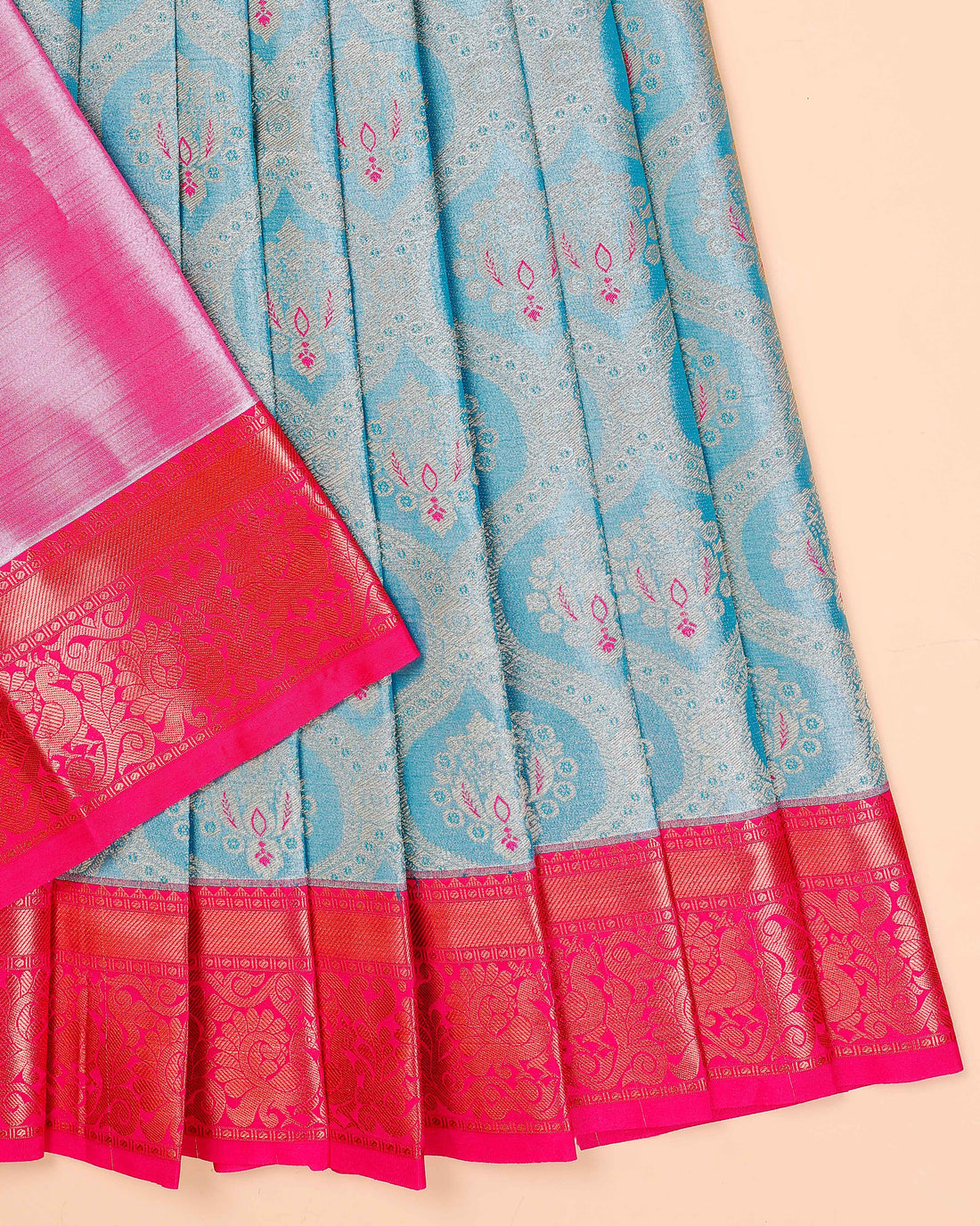Traditional Pattu Pavadai Material with Floral and Paisley Designs - Sky Blue