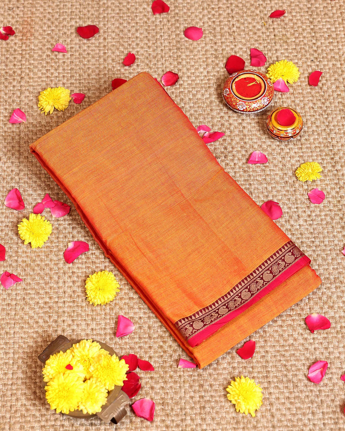 Traditional Handloom Narayanpet Cotton Saree with Traditional Temple Border Design - Orange