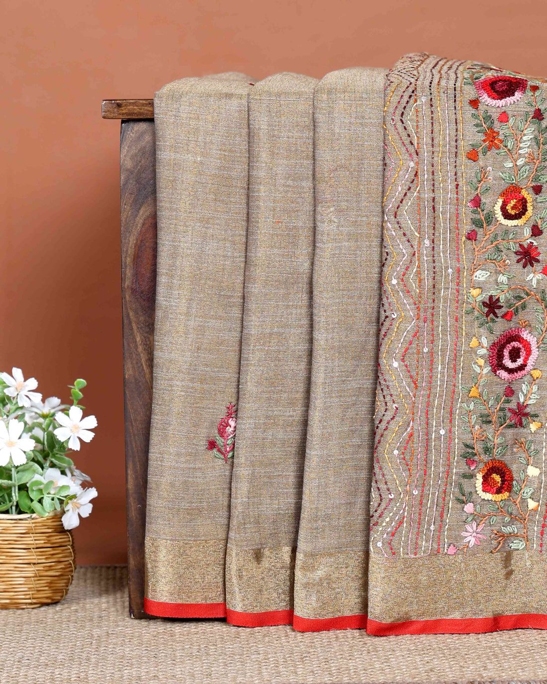 Elegant Hand Embroidered Kantha Work Tussar Saree with Traditional Floral Motifs - Sandal