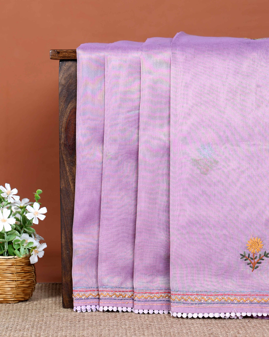 Elegant Hand Embroidered Kantha Work Saree with Delicate Floral Motif and Embroidered Border - Lavender