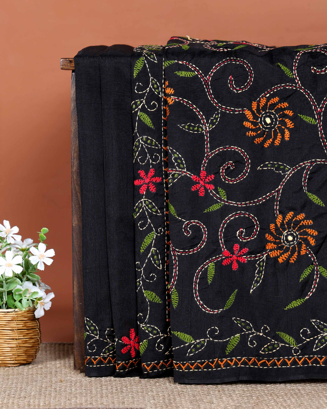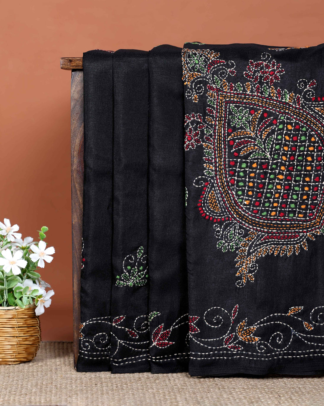 Elegant Hand Embroidered Kantha Work Saree with Intricate Floral and Paisley Motifs and Embroidered Border - Black