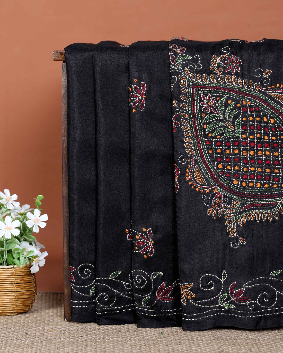 Elegant Hand Embroidered Kantha Work Tussar Saree with Intricate Floral and Paisley Motifs - Black