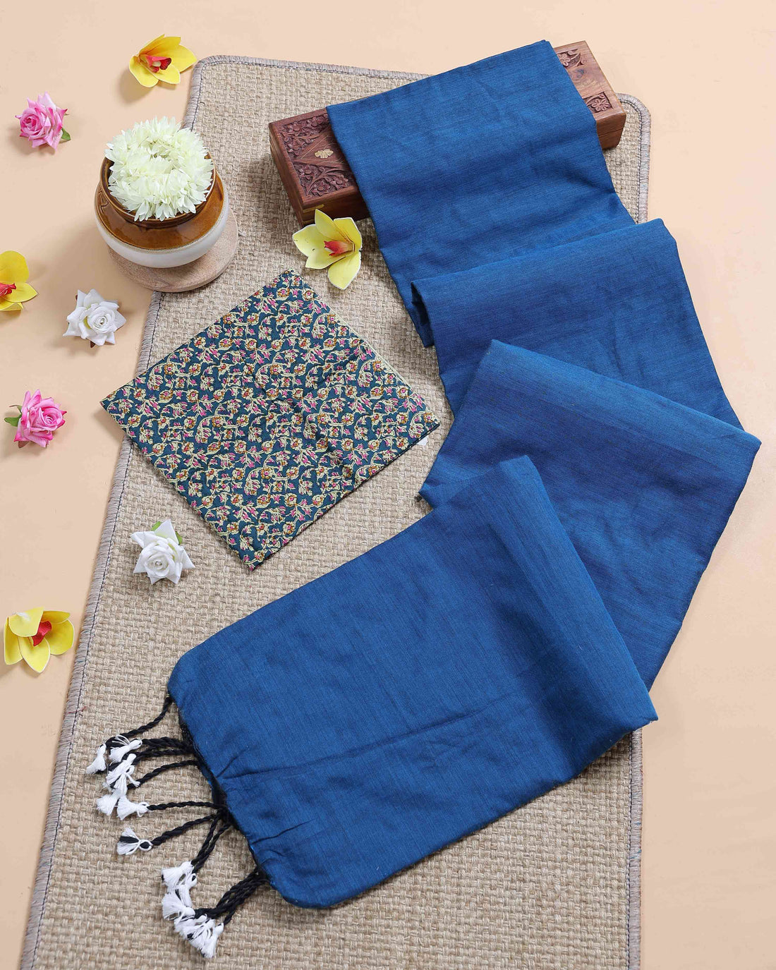 Traditional Khadi Cotton Saree with Contrast Printed Blouse and Tassel Accents - Royal Blue