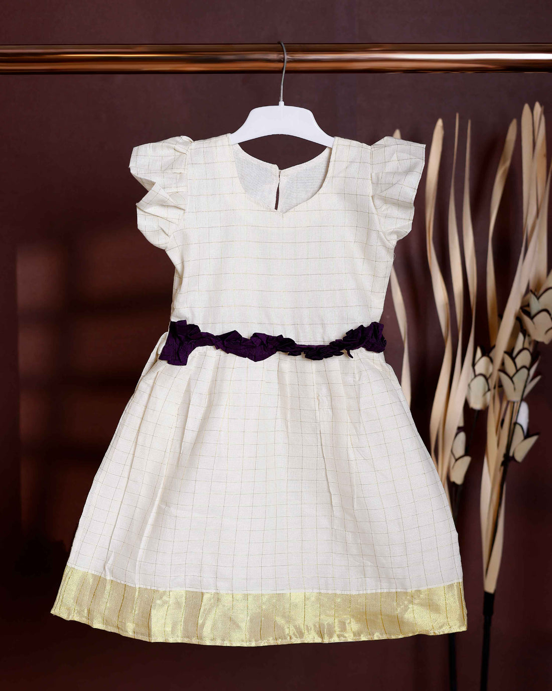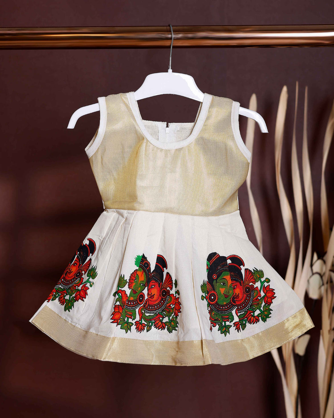 Traditional Kids' Frock with Kerala Mural Art Print - Cream