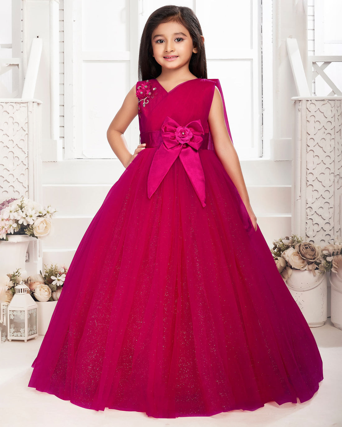 Kids' Elegant Sleeveless Gown Frock with Waist Bow and Sparkling Netting - Purple