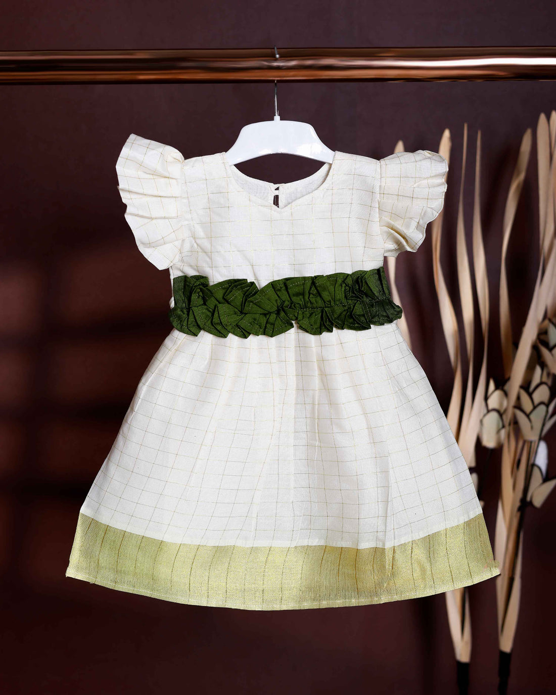 Girls' Traditional Kerala Kasavu Style Frock with Gold Zari Border and Waist Embellishment - Off White