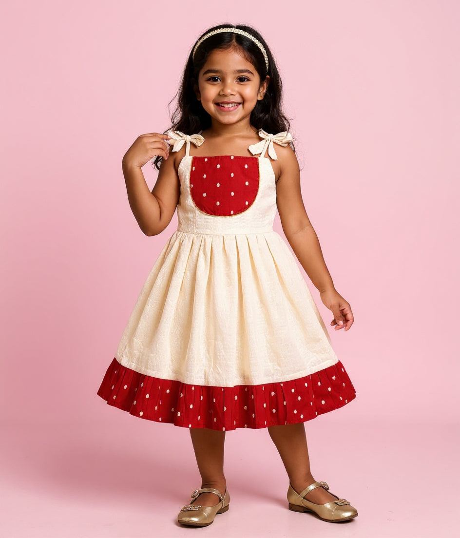 Girls' Traditional Handloom Frock with Ruffled Waistband and Gold Border - Off White