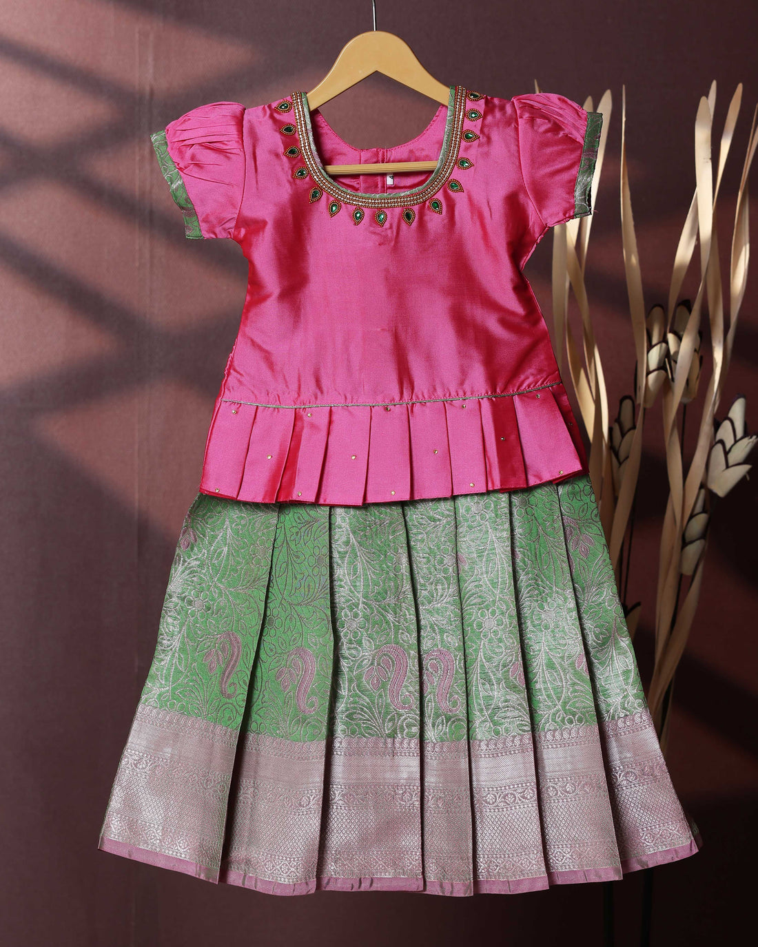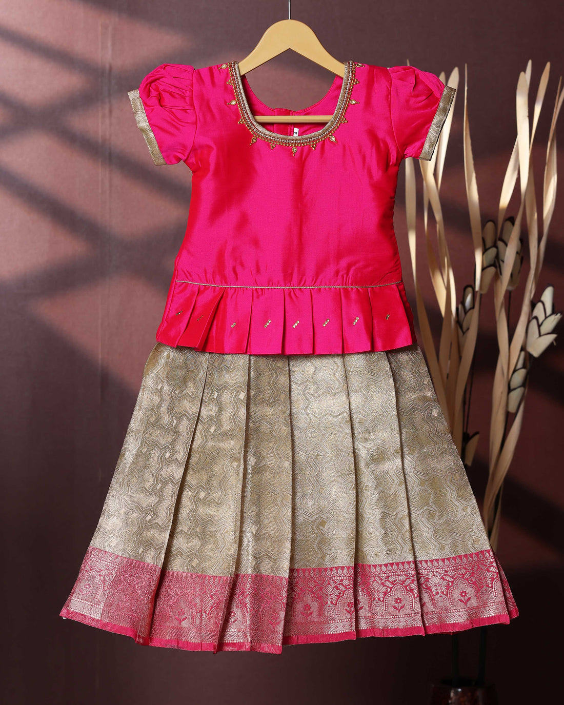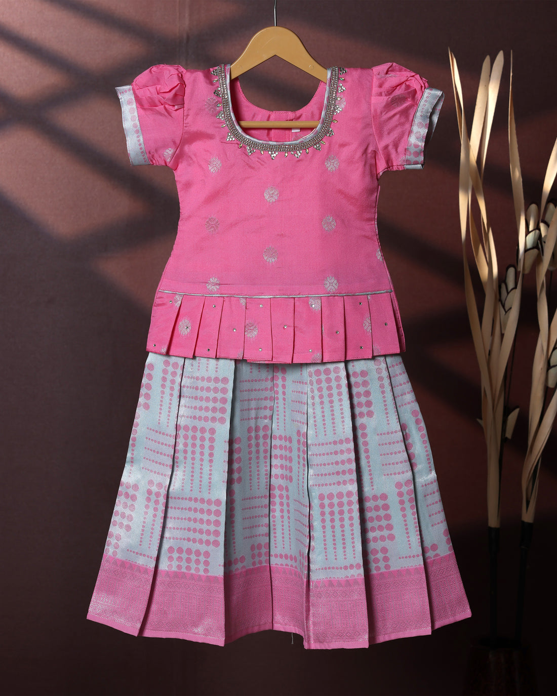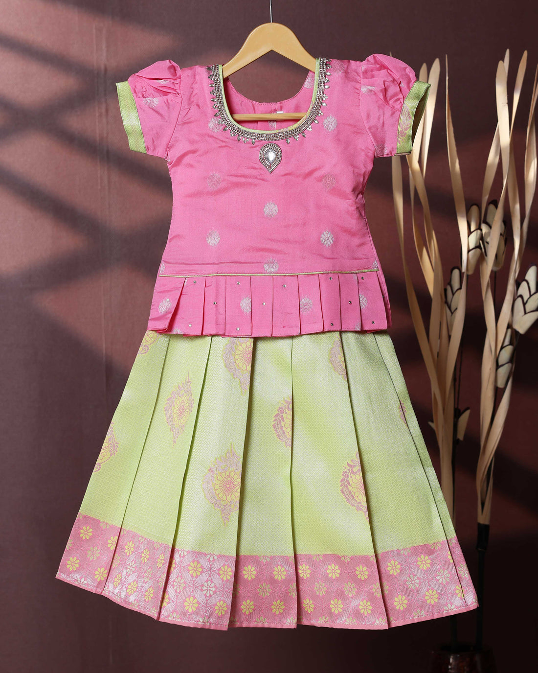 Traditional Pattu Pavadai Set With Zari Woven Skirt And Embroidered Blouse- Pink