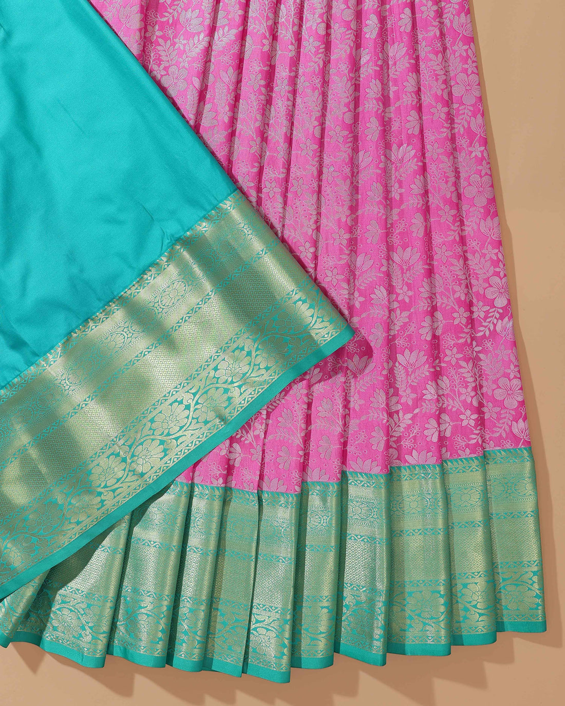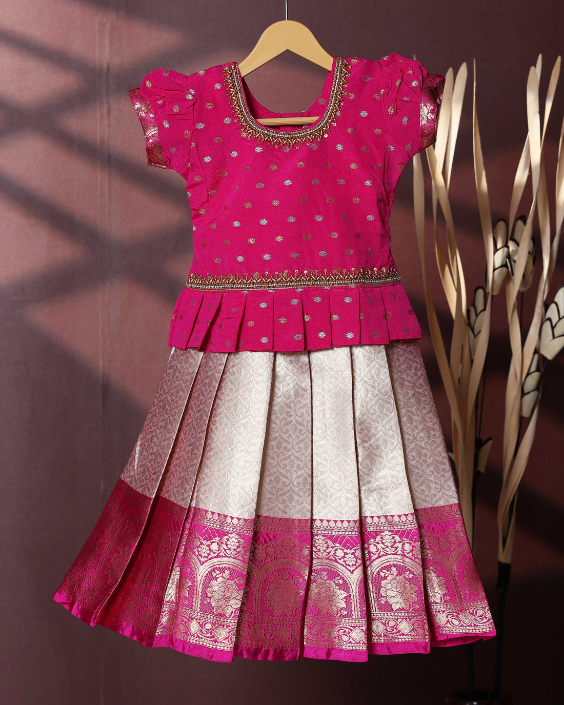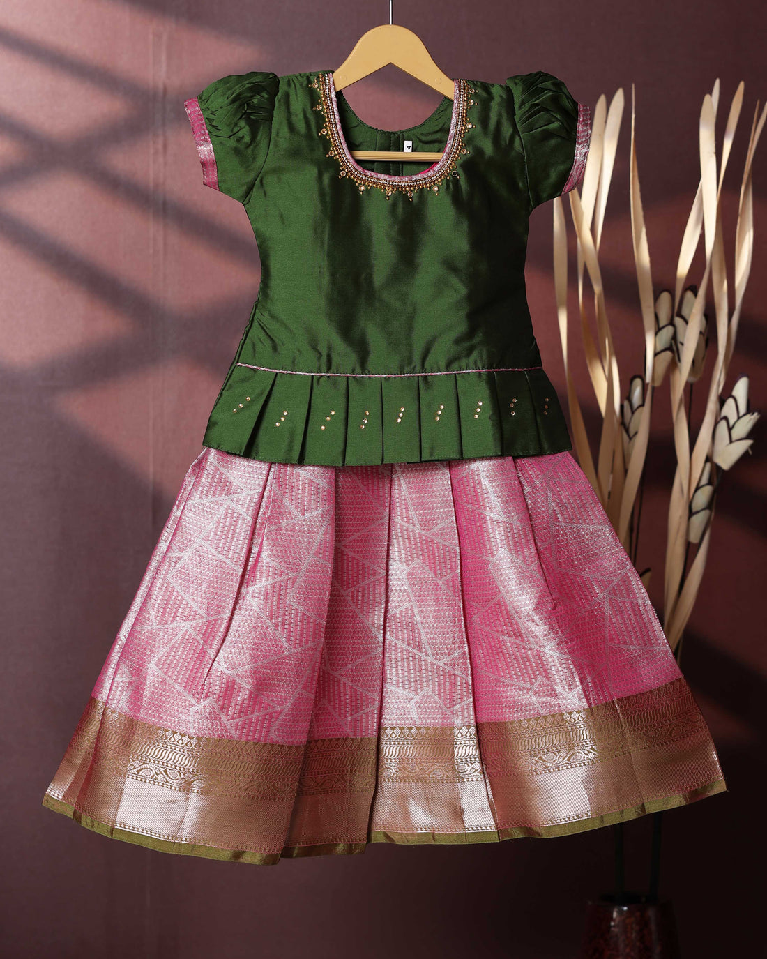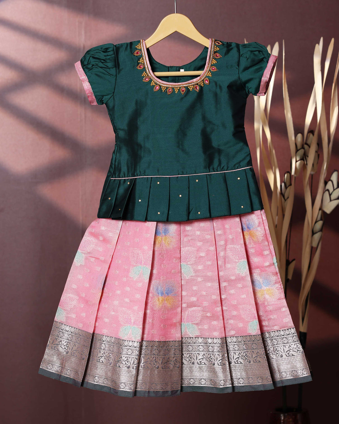 Traditional Pattu Pavadai Set With Zari Woven Skirt And Embroidered Blouse- Pink