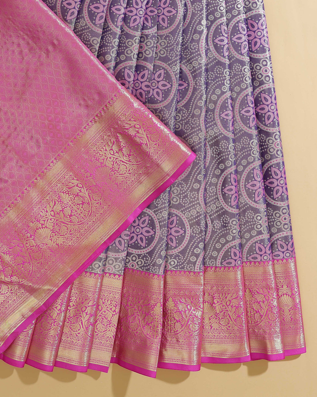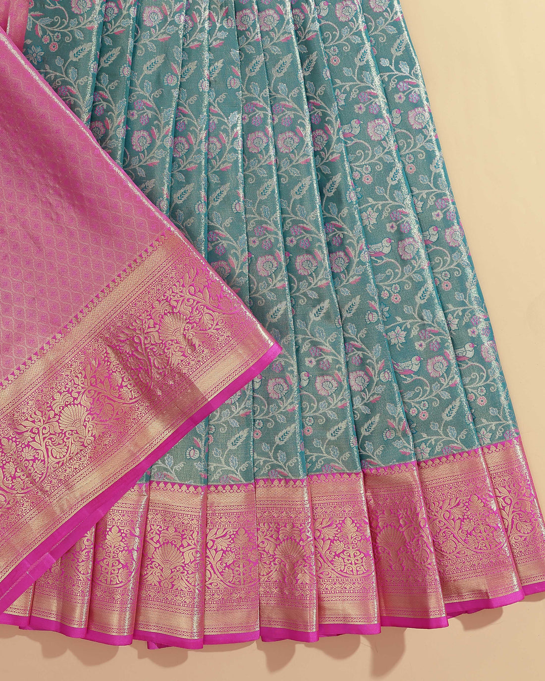 Kanchipuram Pattu Pavadai Material with Intricate Floral & Zari Woven Border - Grey
