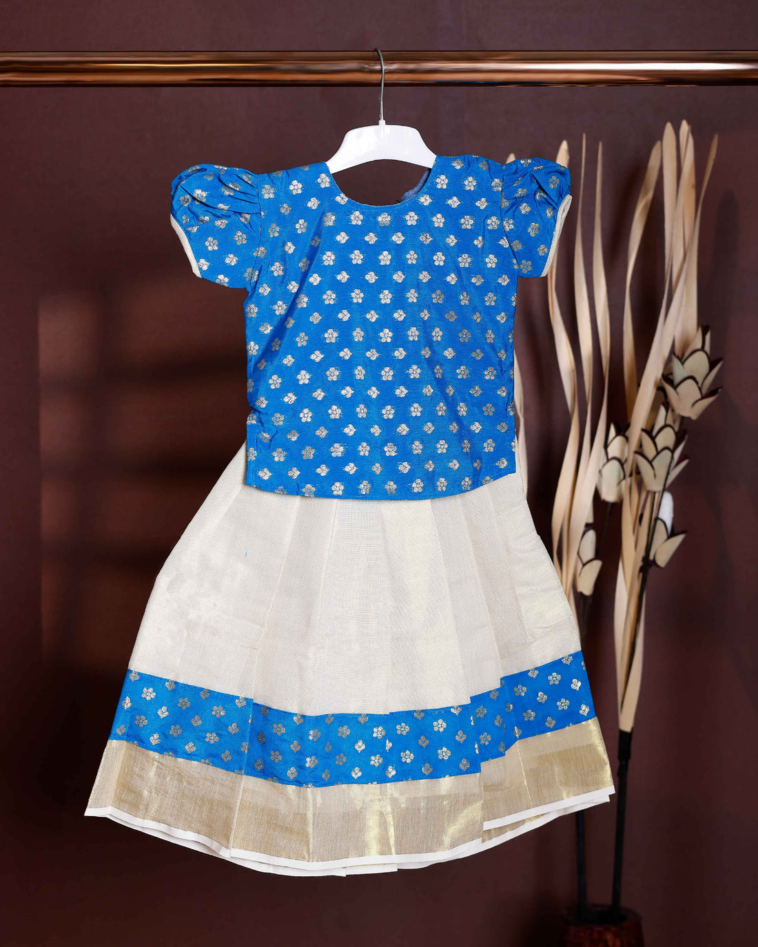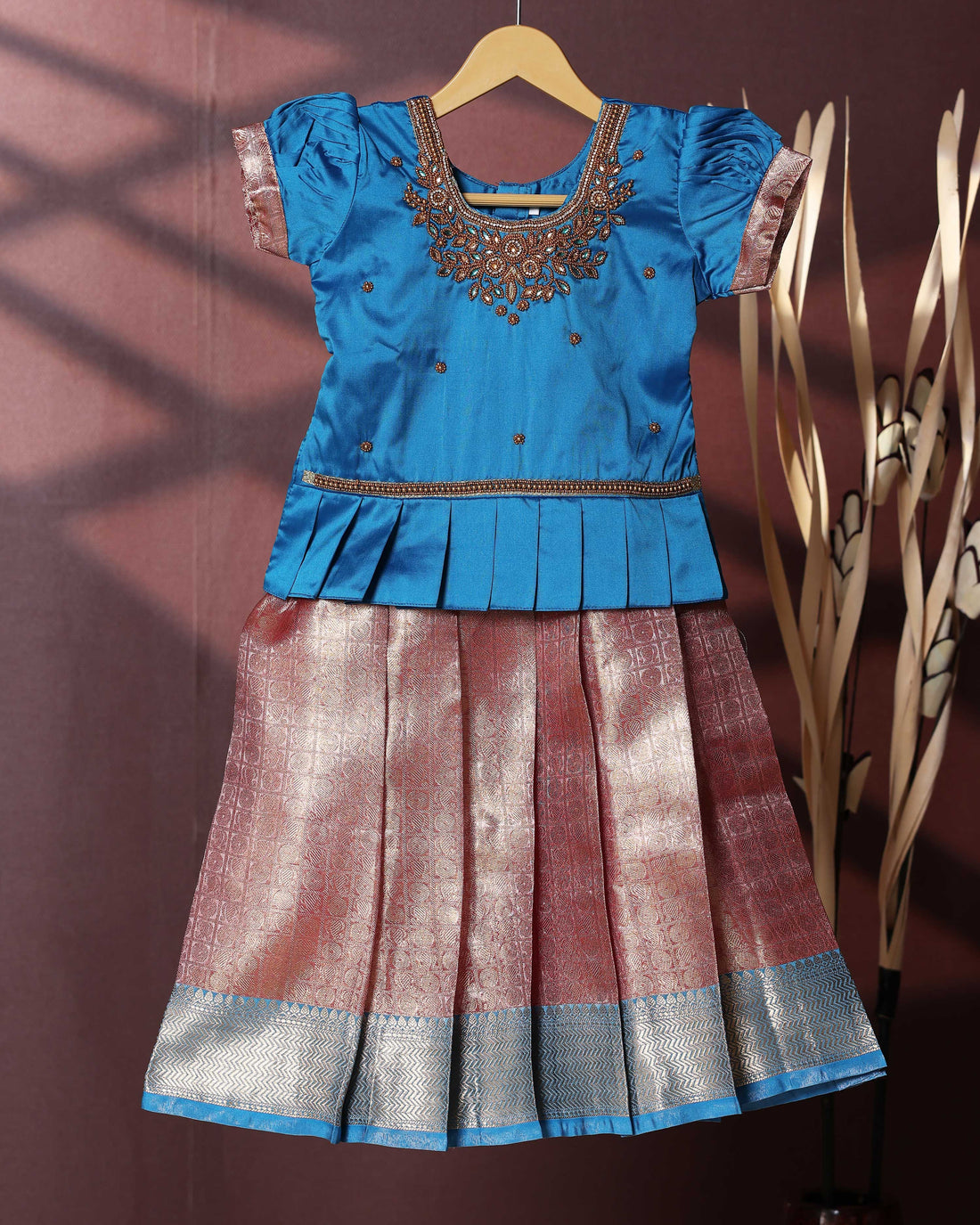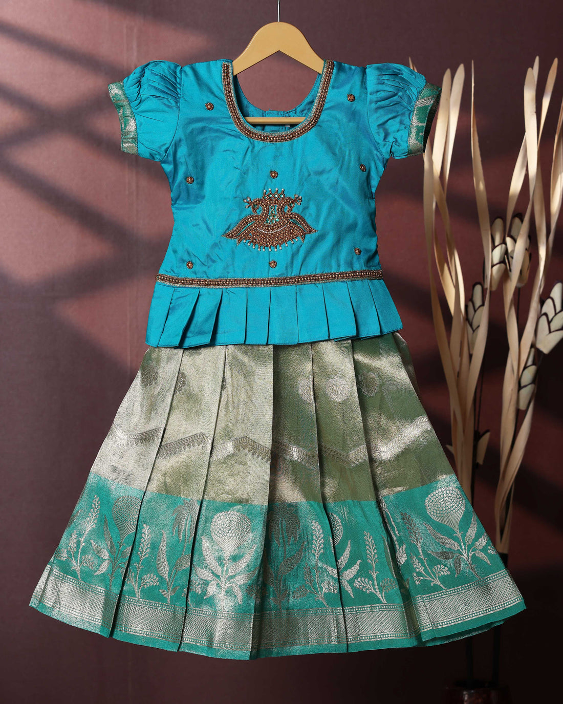 Kids Readymade Pattu Pavadai Set with Traditional Motifs - Blue