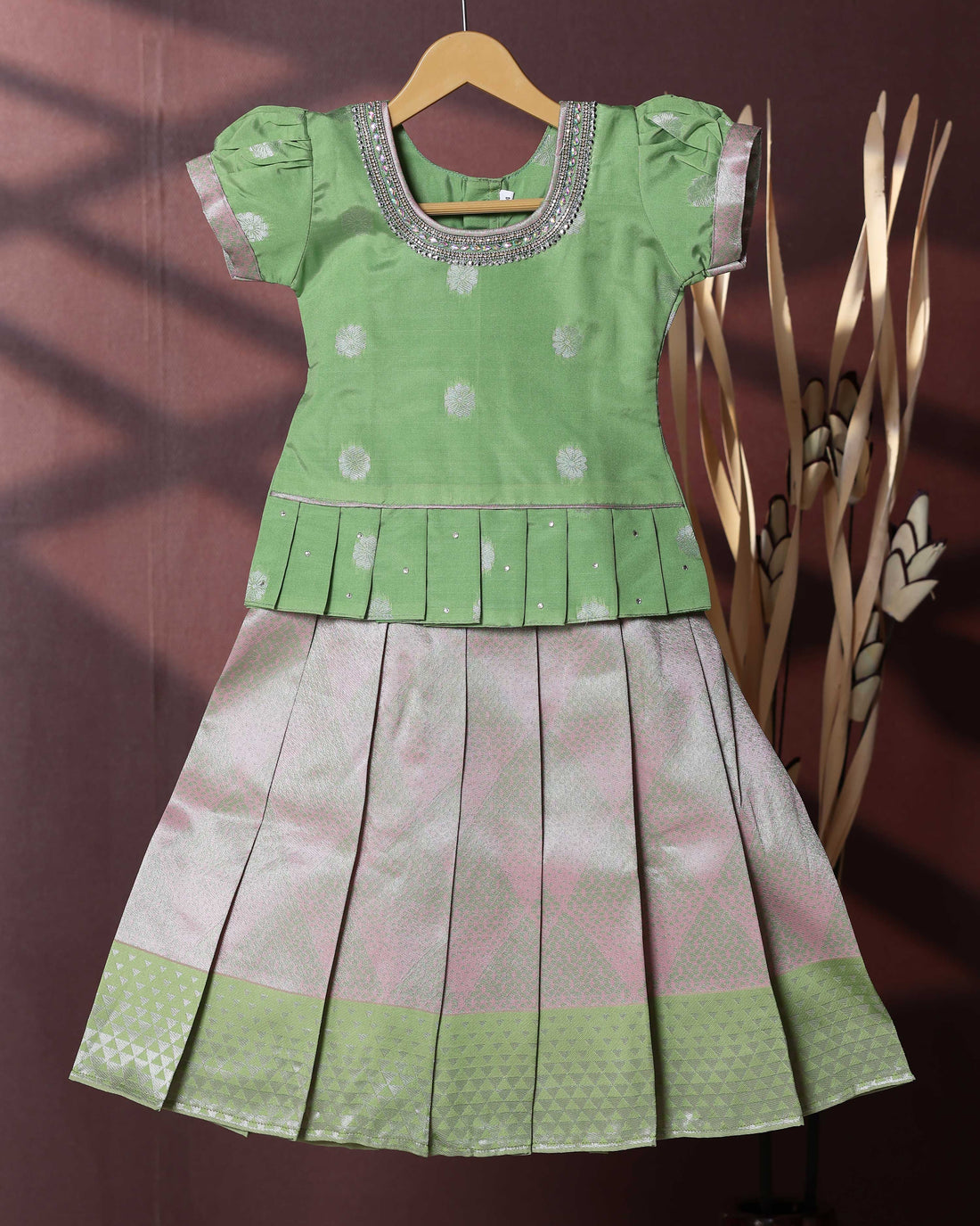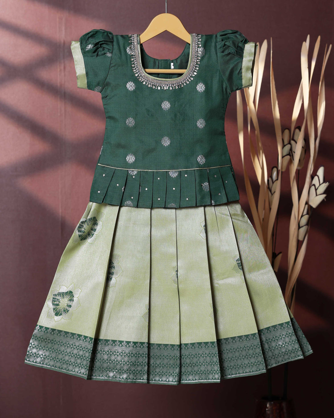 Traditional Pattu Pavadai Set With Zari Woven Skirt And Embroidered Blouse- Green