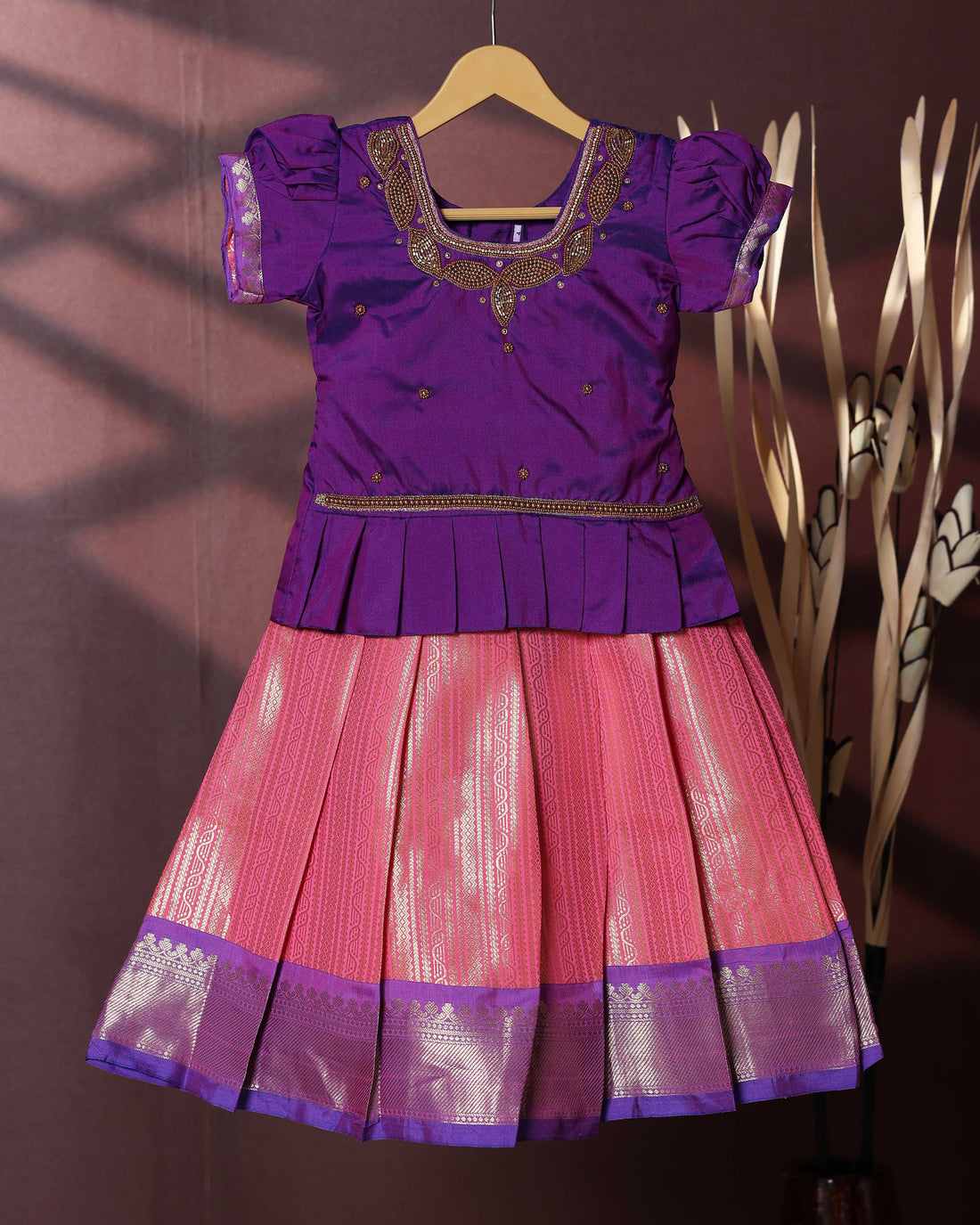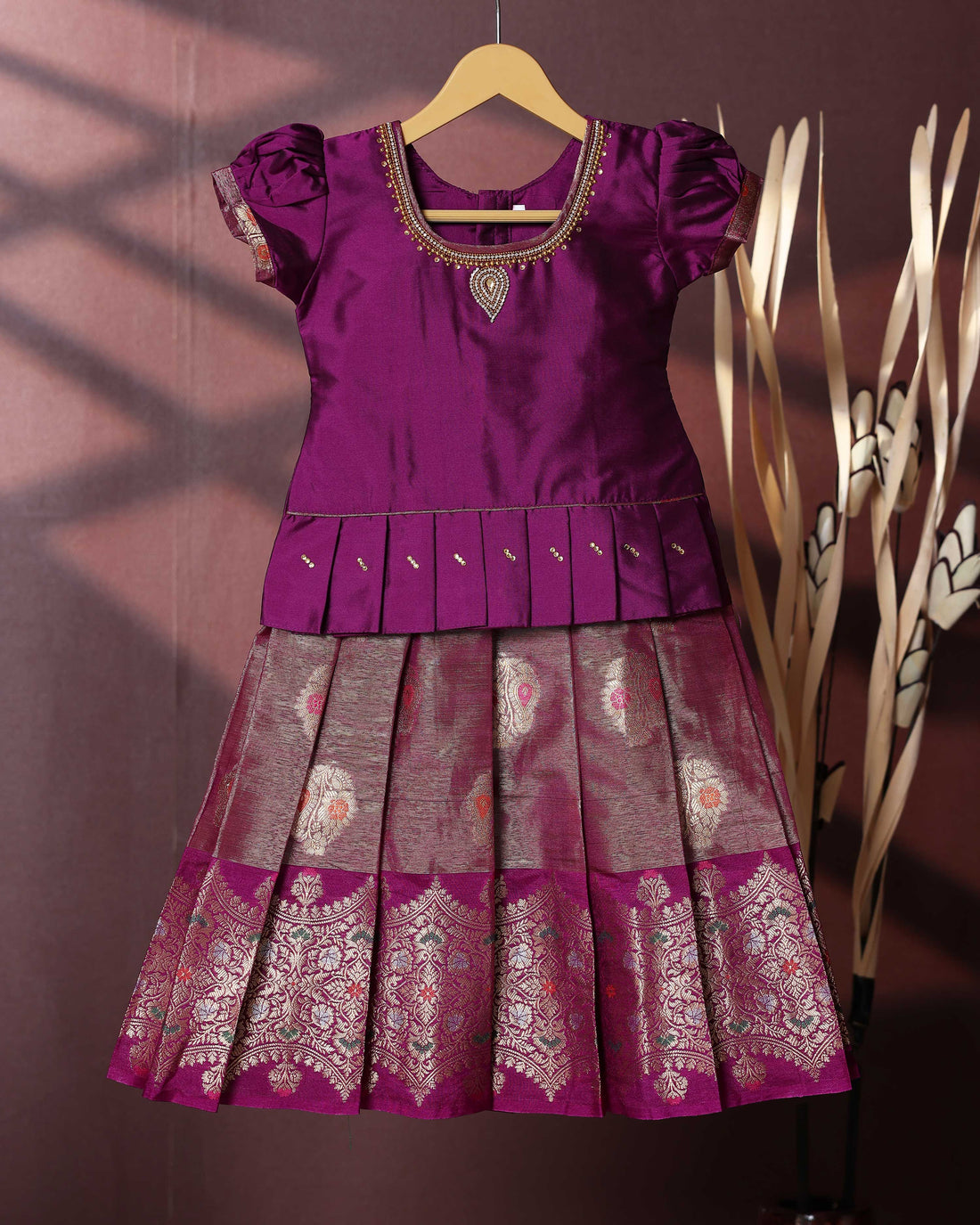 Traditional Pattu Pavadai Set With Zari Woven Skirt And Embroidered Blouse- Purple