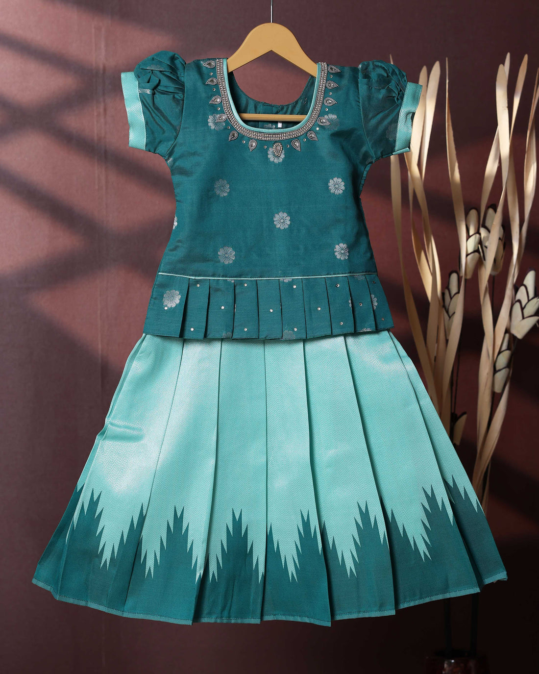 Traditional Pattu Pavadai Set With Zari Woven Skirt And Embroidered Blouse - Teal