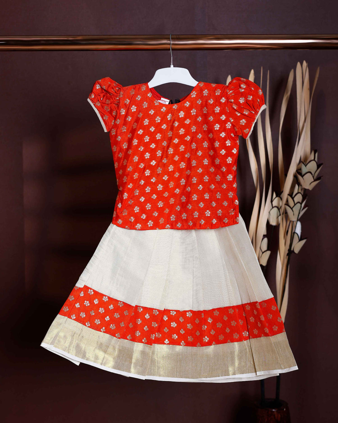 Kids Readymade Pattu Pavadai Set with Traditional Motifs - Dark Orange