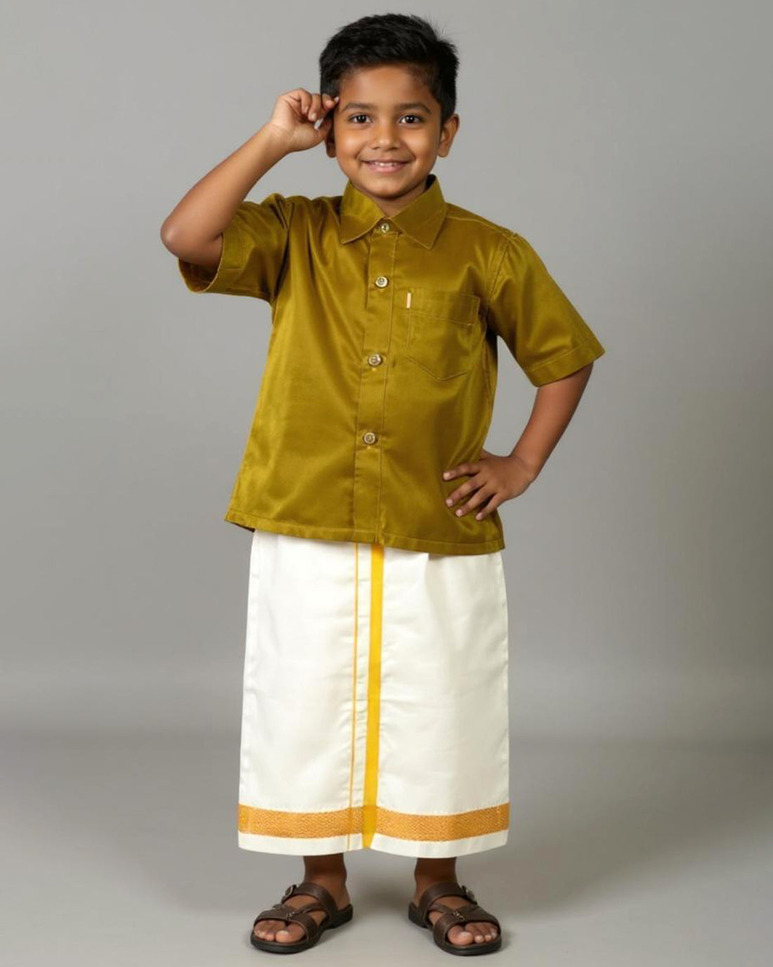 Traditional Kids Shirt and Dhoti Set - Olive Green