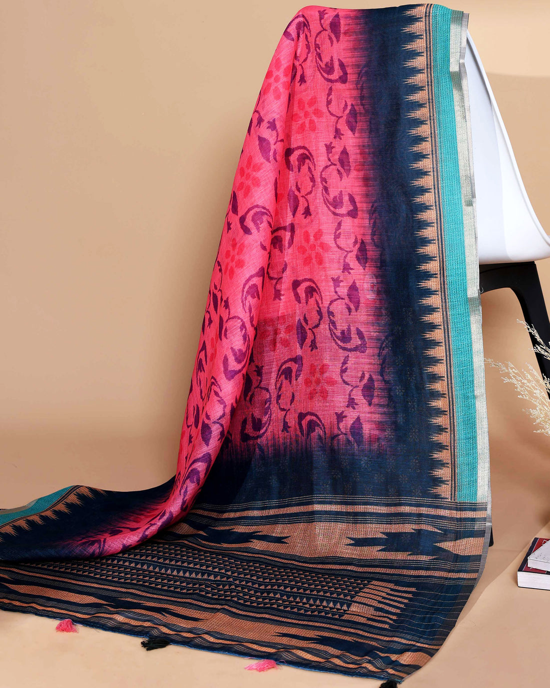 Ethnic Pink Linen saree with Multi-color Paisley and Floral Design
