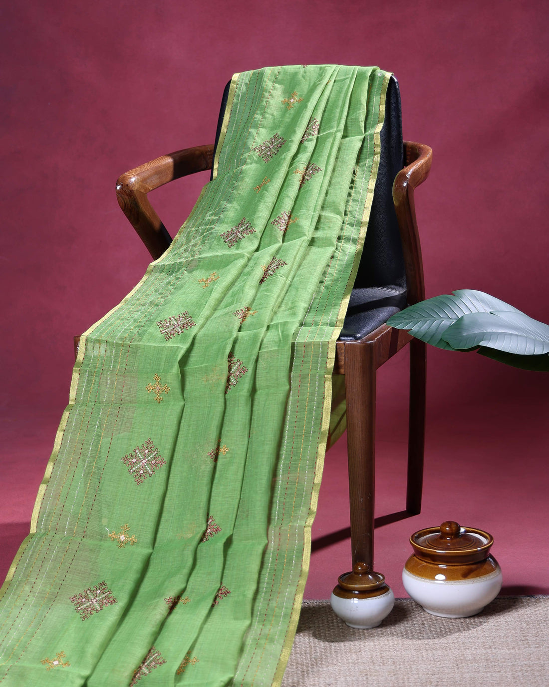Elegant Linen Cotton Saree with Intricate Geometric Buti Embroidery and Woven Border - Green