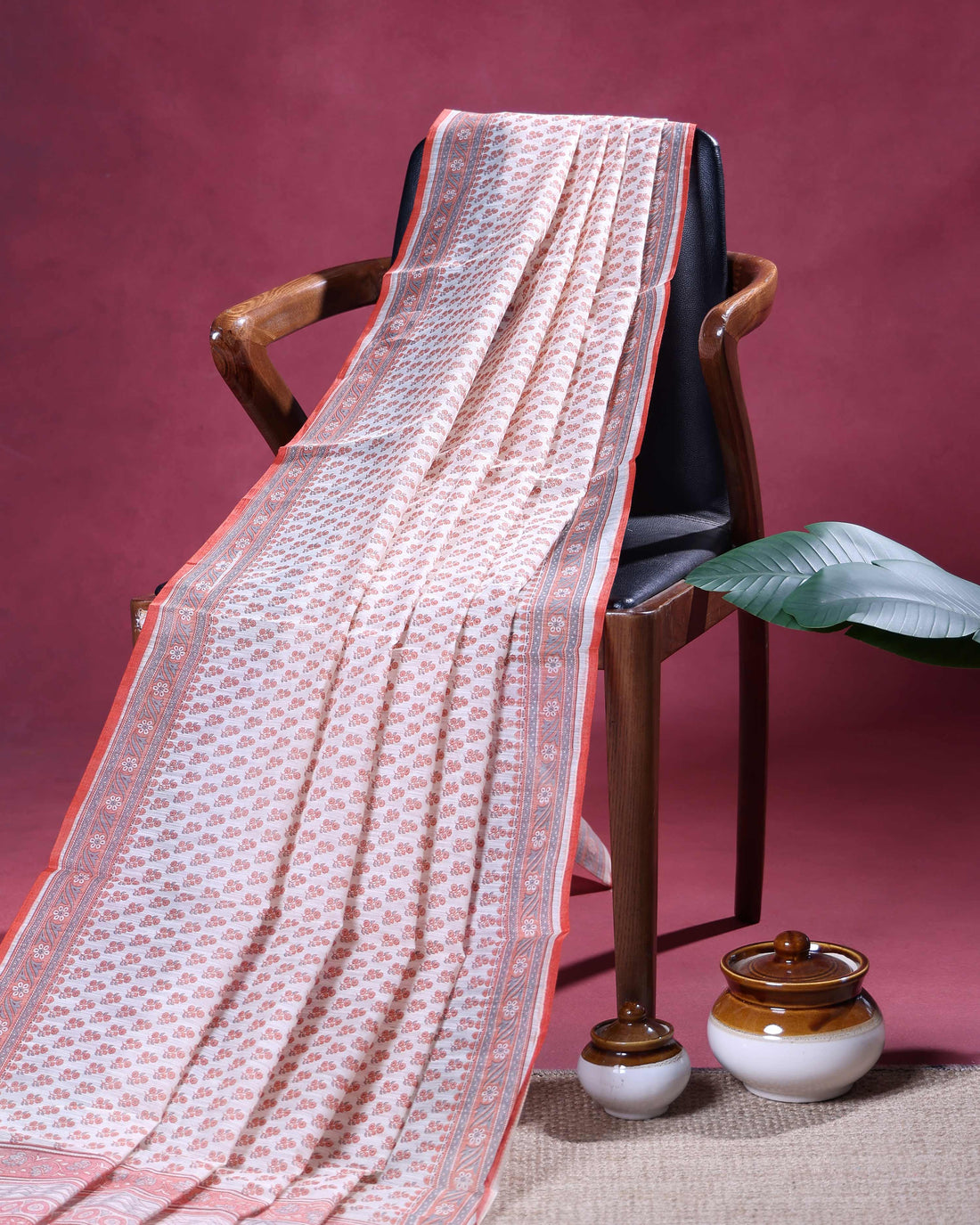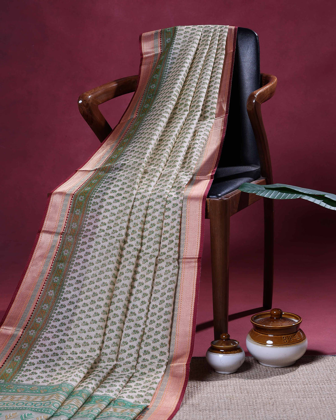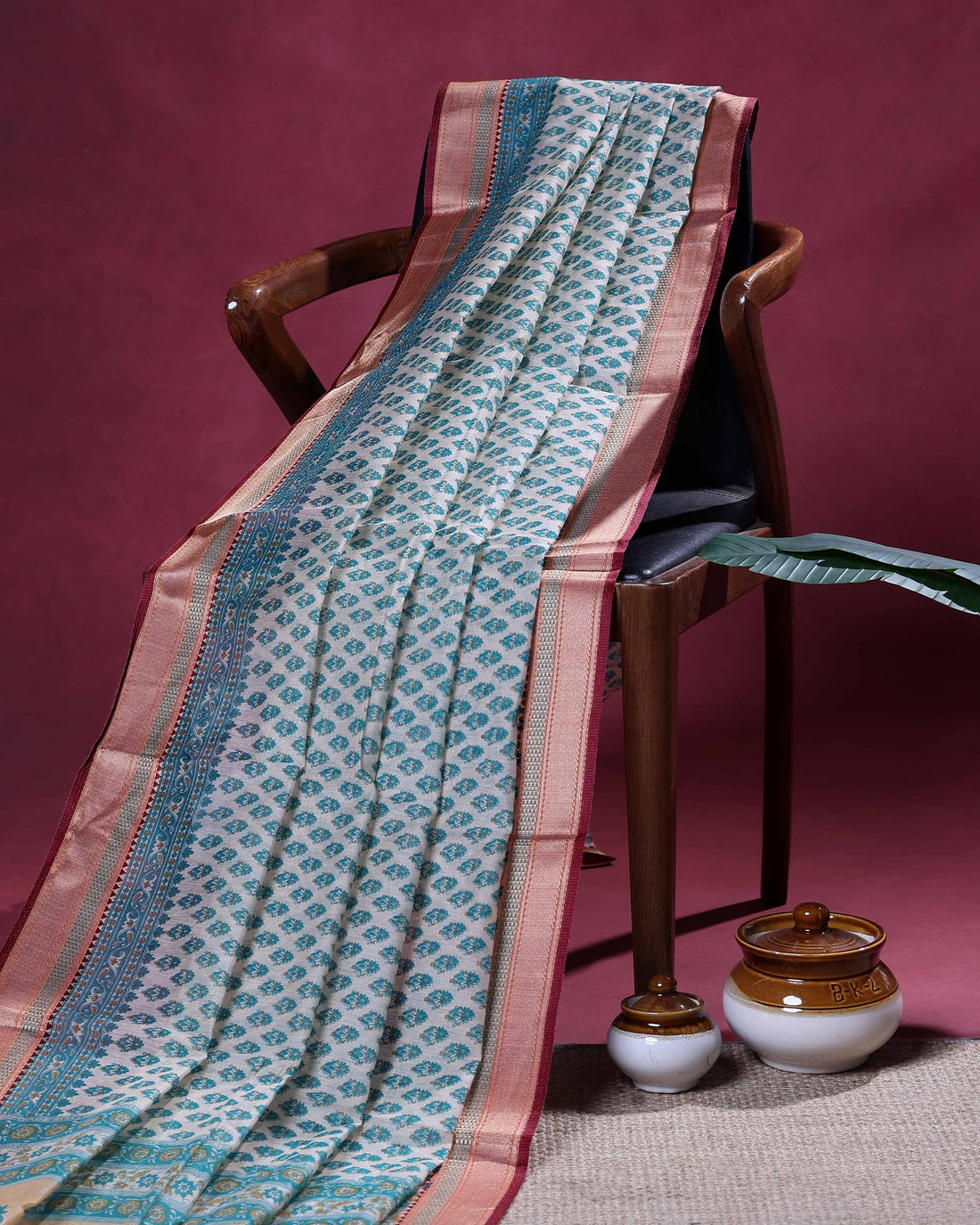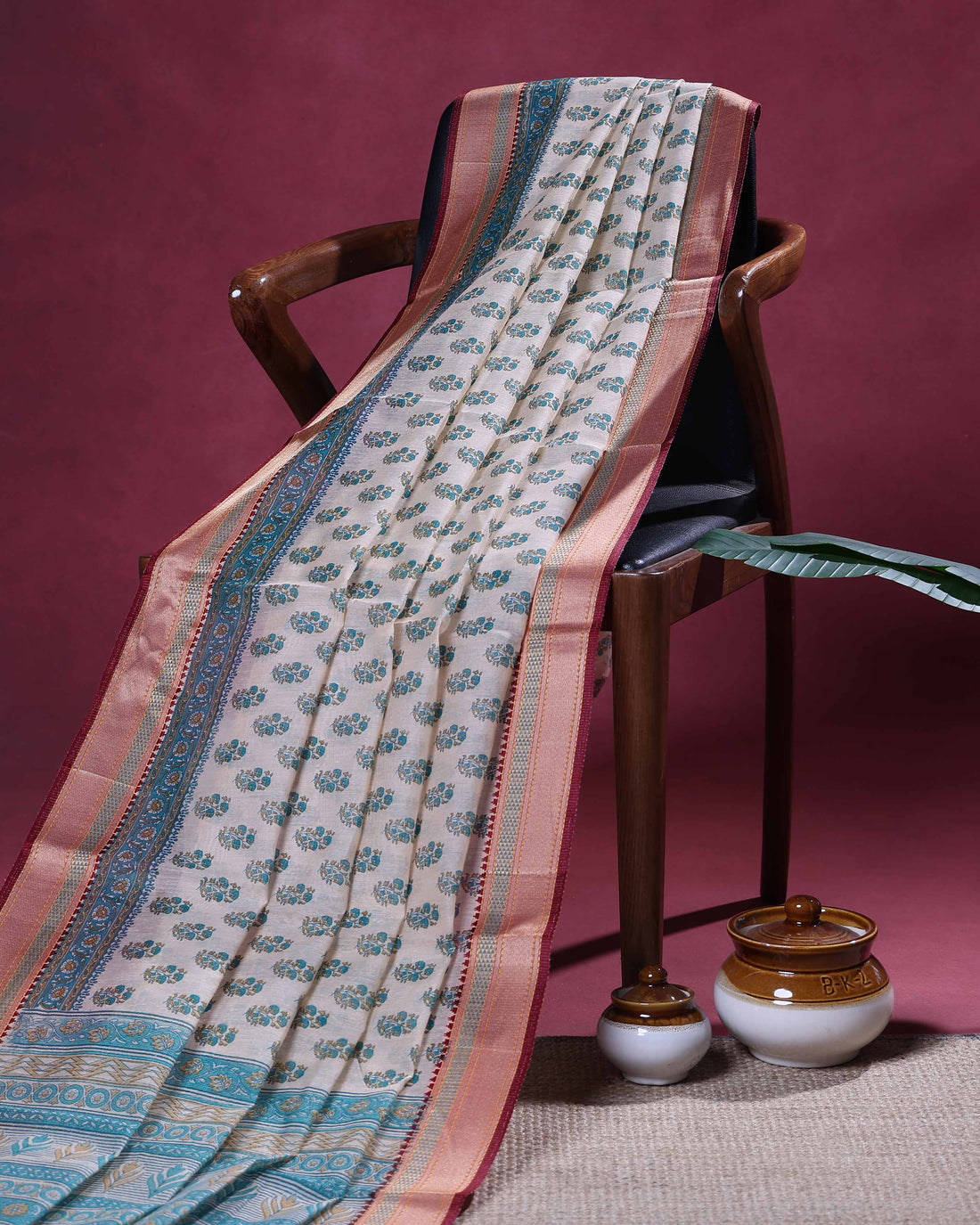 Elegant Linen Cotton Saree with All-Over Floral Buti Print and Traditional Woven Border - Off White