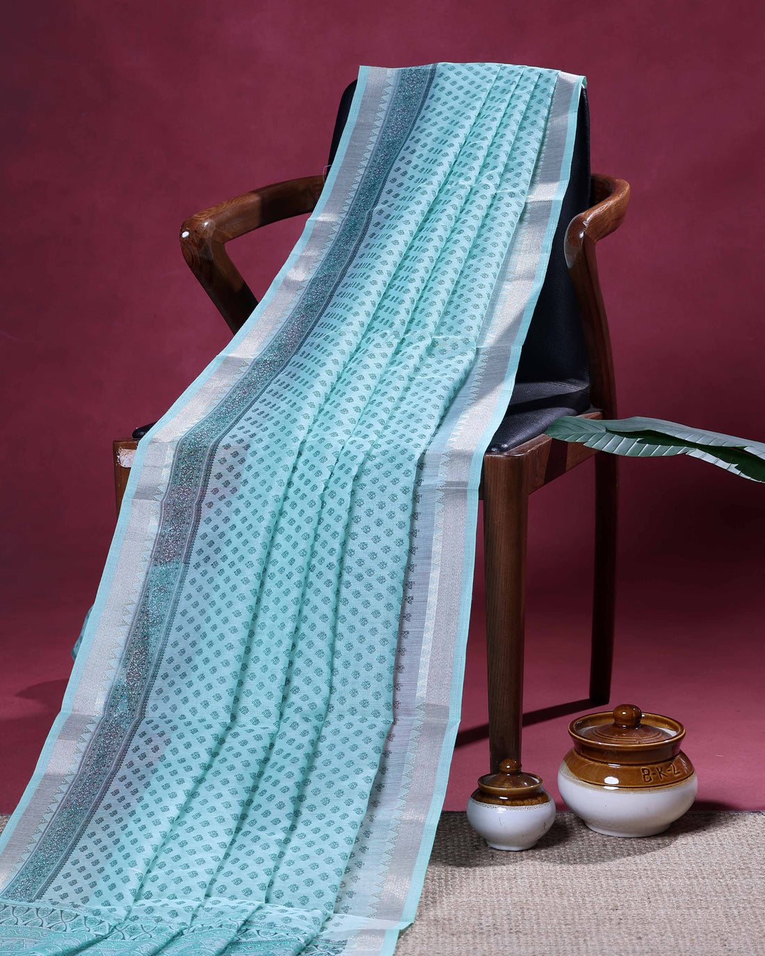 Traditional Linen Cotton Saree with Delicate Small Butta Pattern and Ornamental Woven Border - Light Green