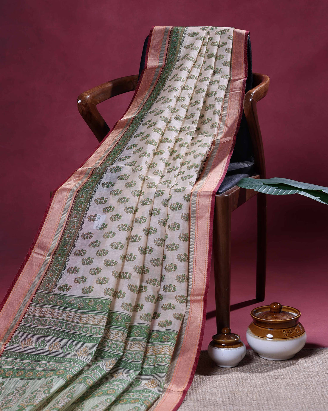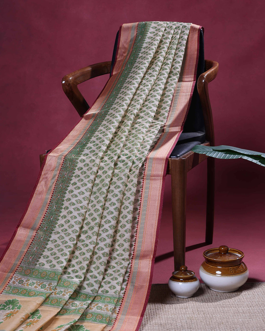 Elegant Linen Cotton Saree with All Over Floral Buta Motifs and Intricately Woven Traditional Border - Cream