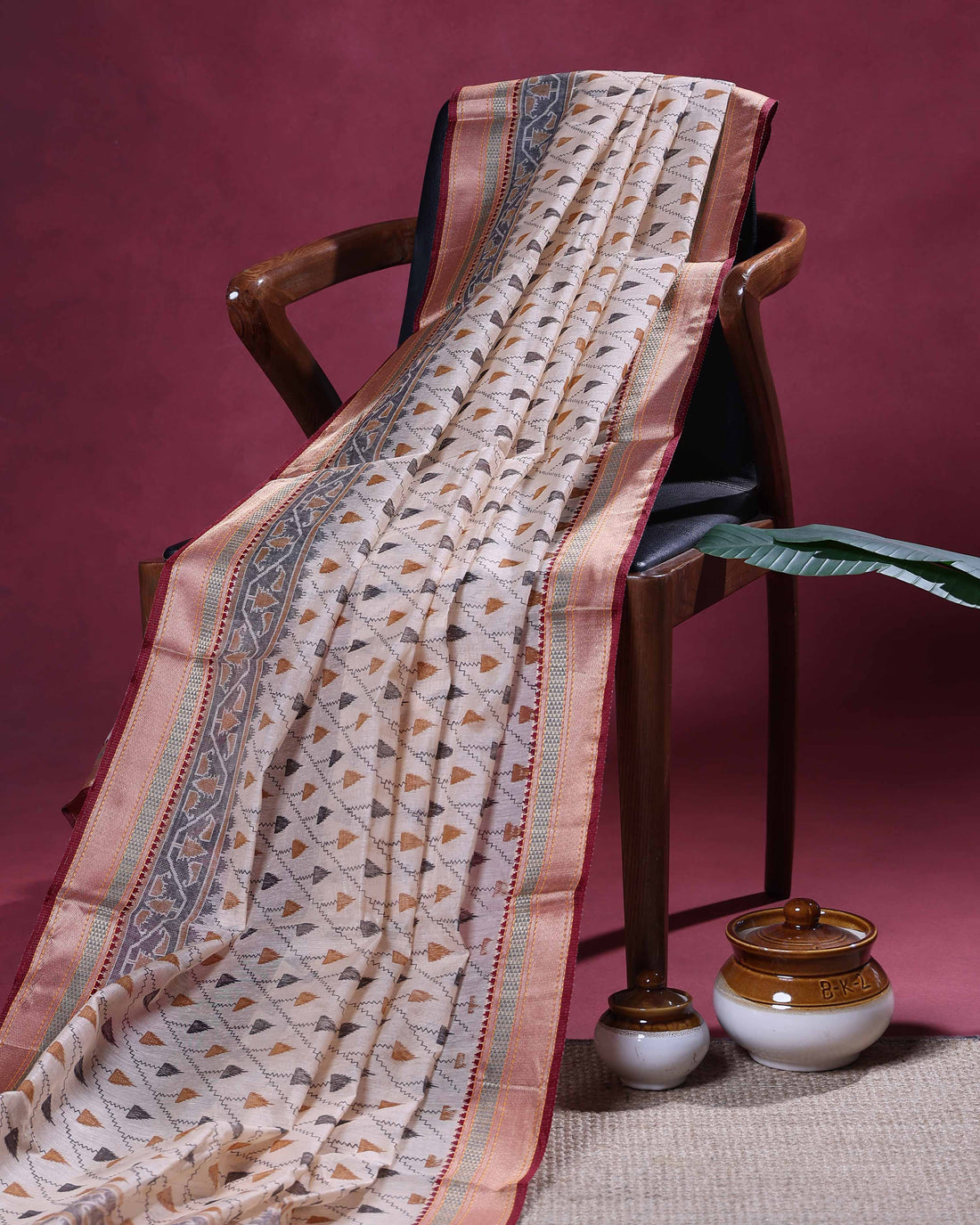 Traditional Linen Cotton Saree with Intricate Woven Border and Subtle Geometric Buta Motifs - Ivory