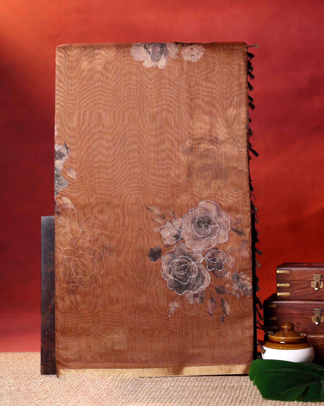 Elegant Linen Blended Saree with Floral Embroidery and Woven Border - Brown