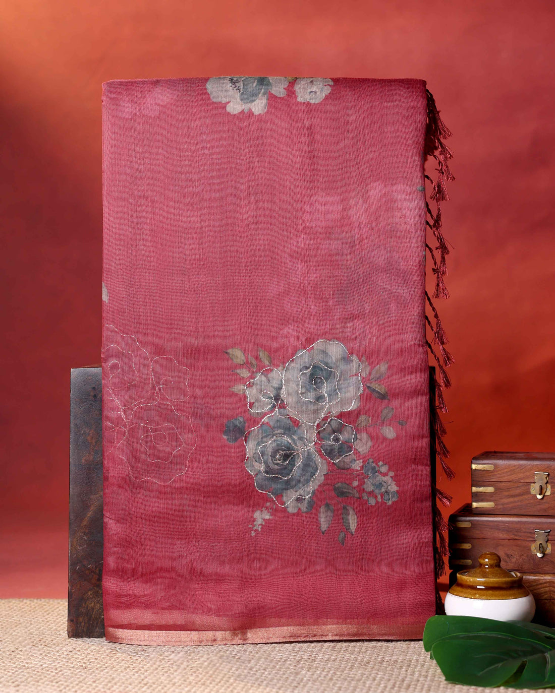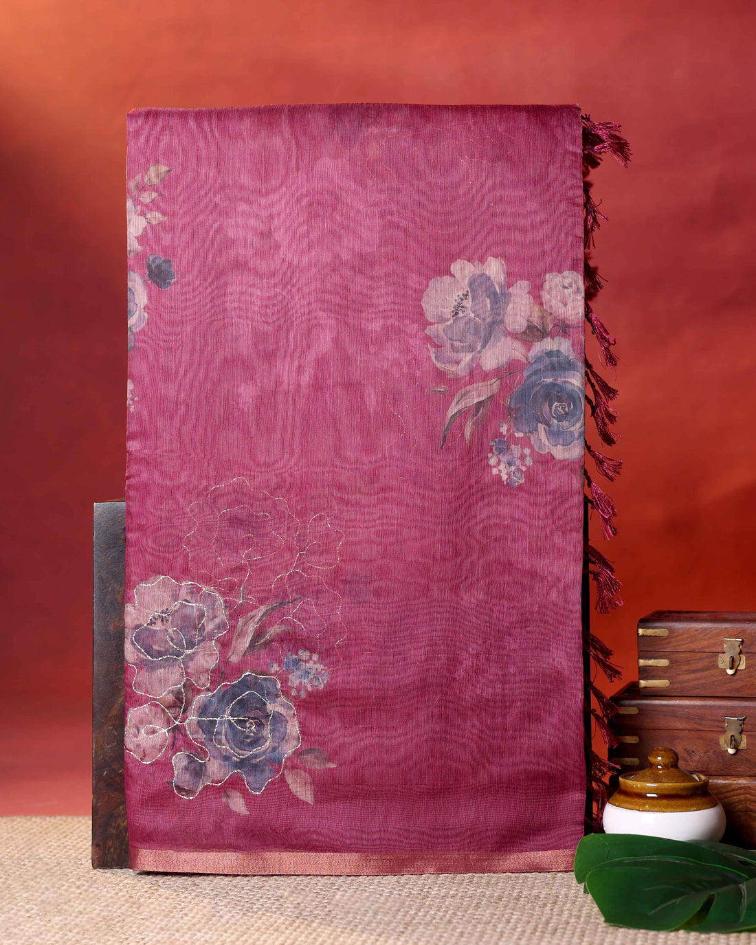 Elegant Linen Blended Saree with Floral Embroidery and Woven Border - Onion Pink