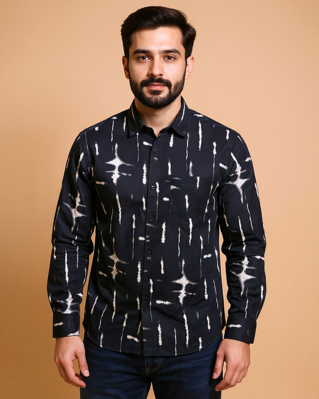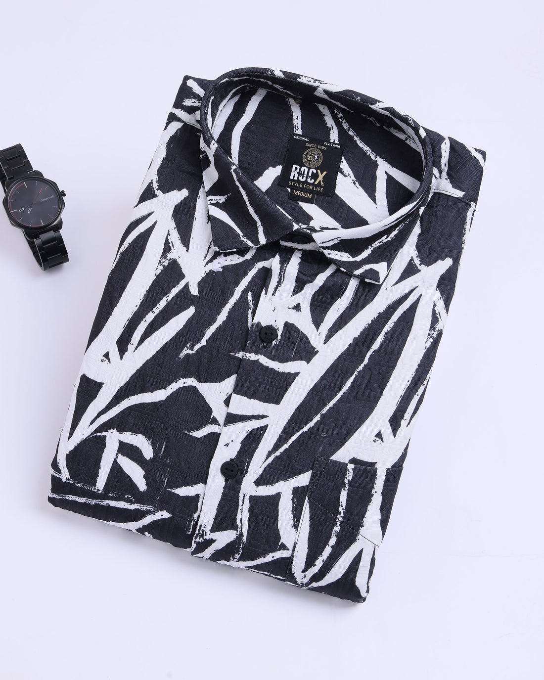 Men's Rocx Casual Shirt with Abstract Print and Spread Collar - Black