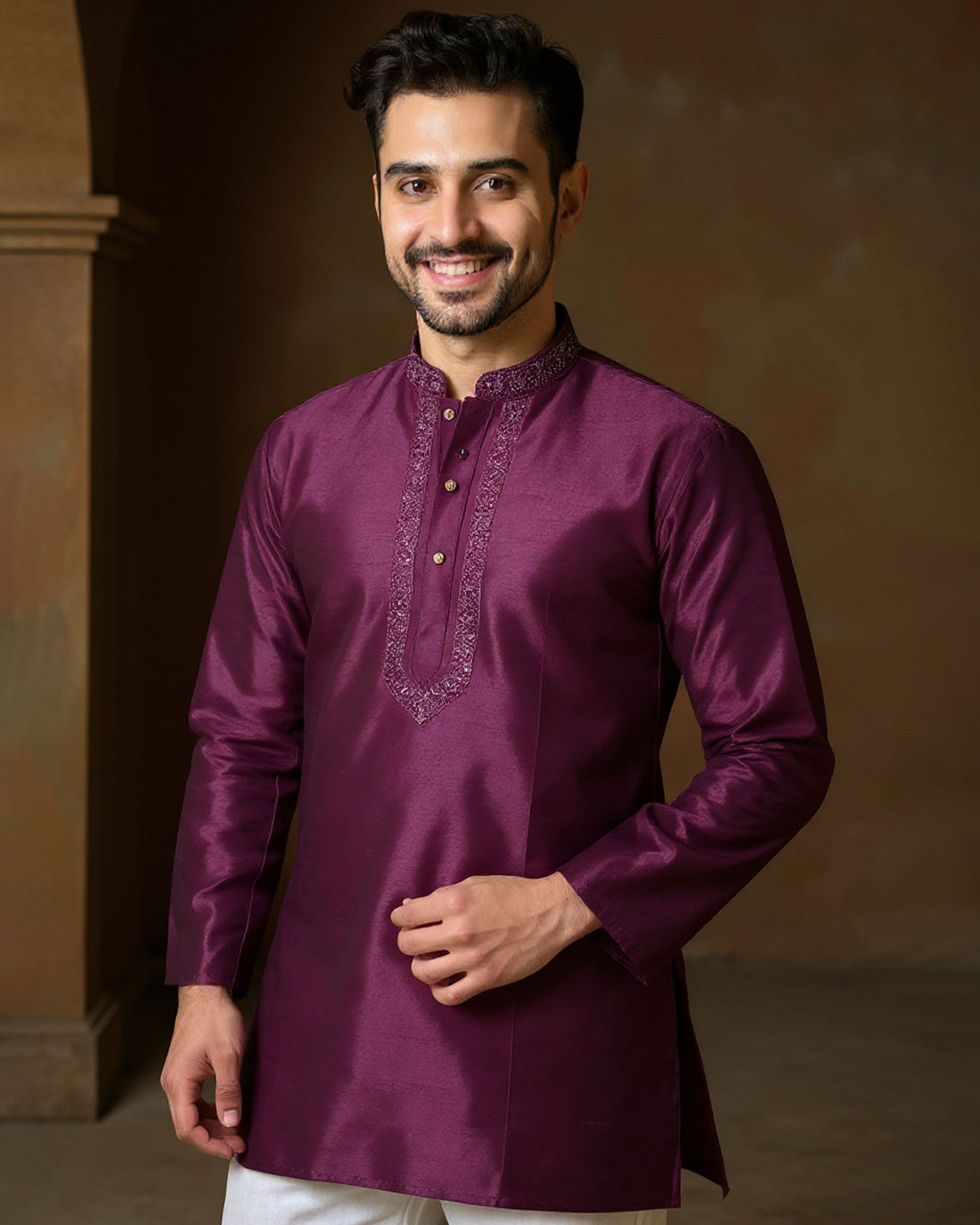 Men's Silk Blend Mandarin Collar Straight Kurta with Thread Work - Purple