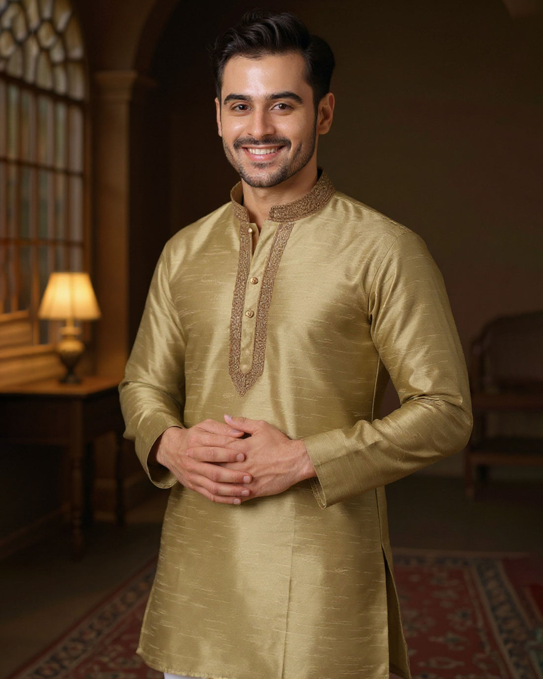 Men's Silk Blend Mandarin Collar Straight Kurta with Thread Work - Sandal