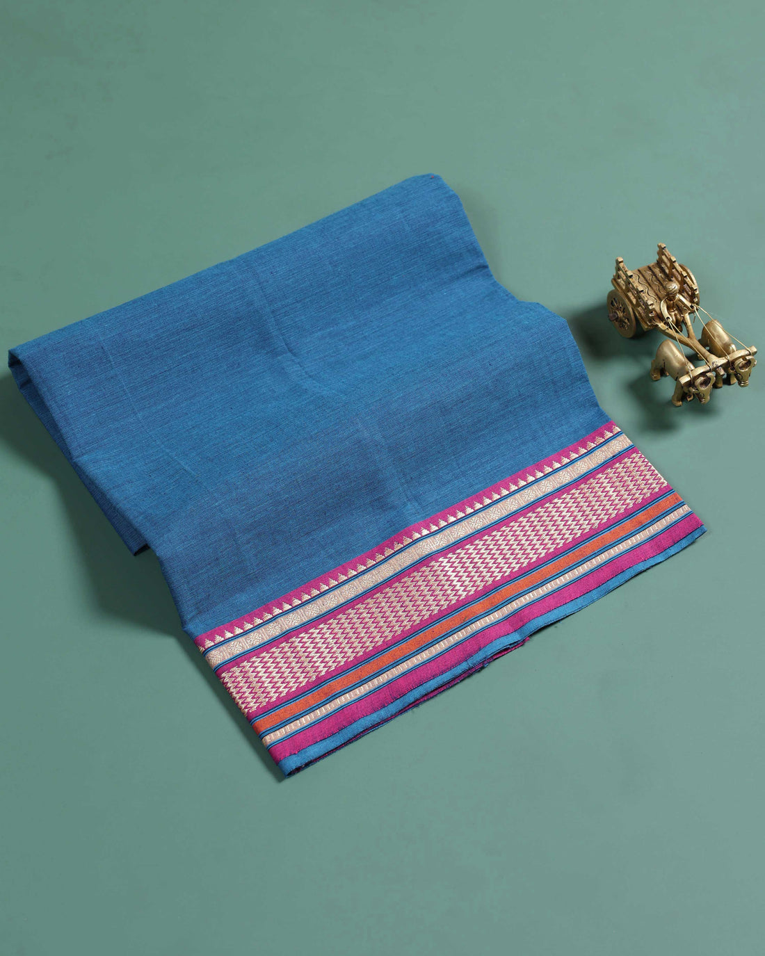 Handloom Cotton 1 Meter Blouse Material with Traditional Woven Border - Blue