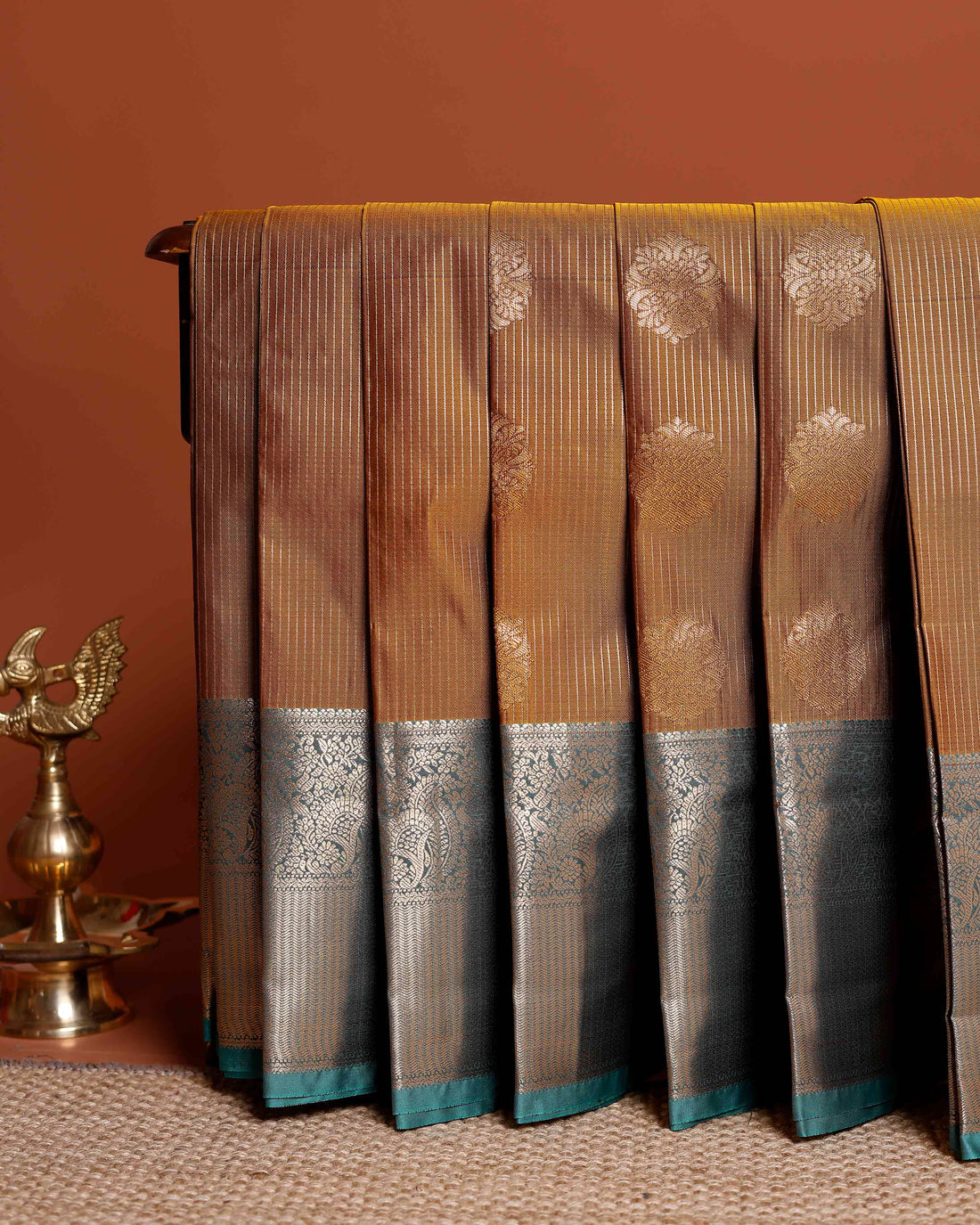Elegant Niranjana Silk Saree with Striped Body, Zari Buttas and Elegant Contrast Border - Golden Brown
