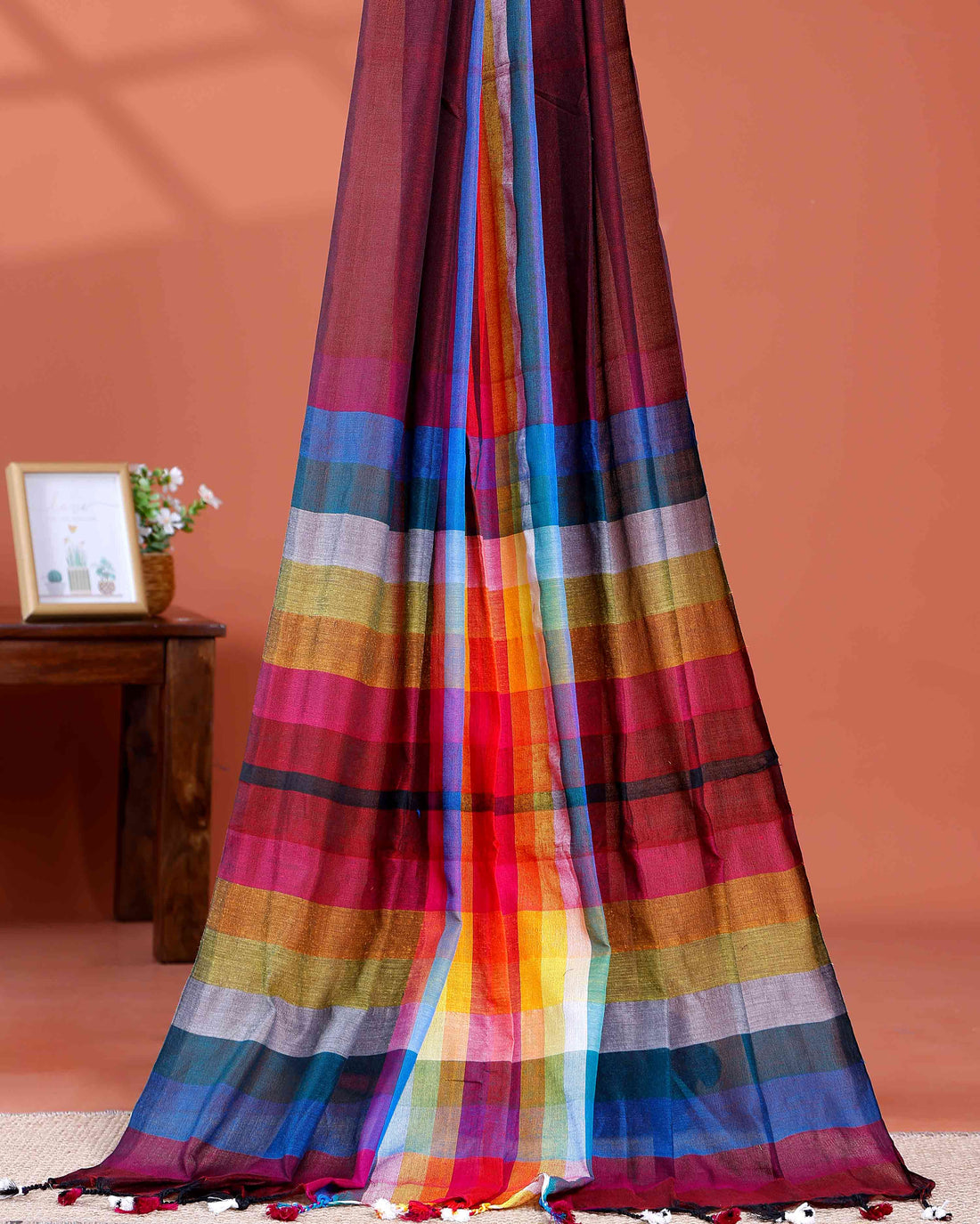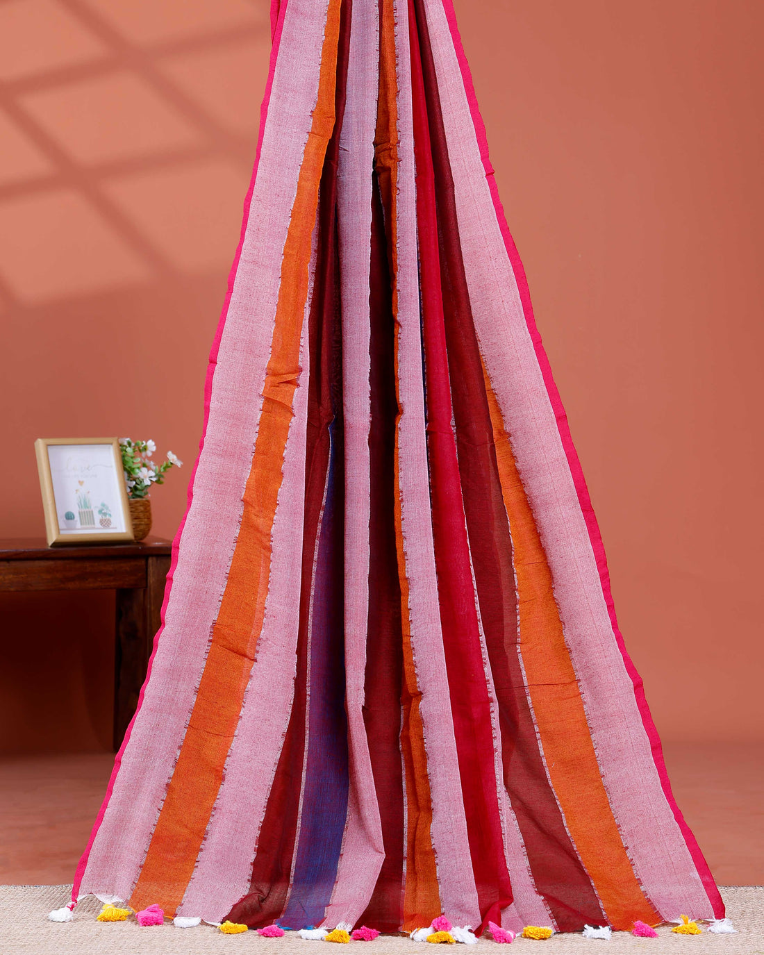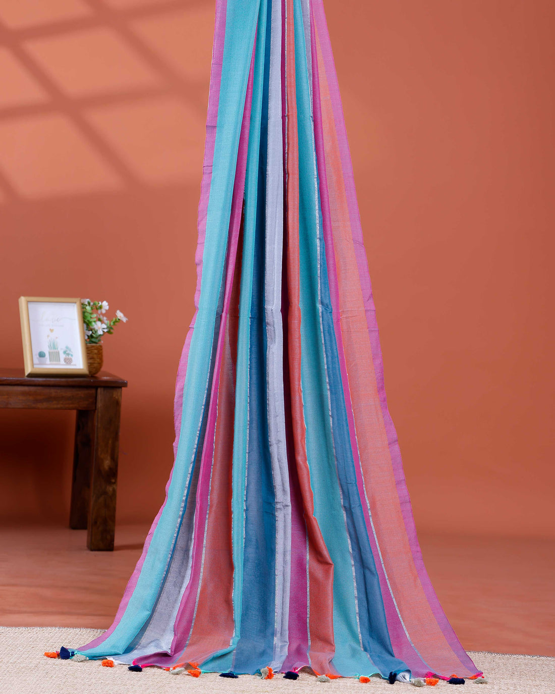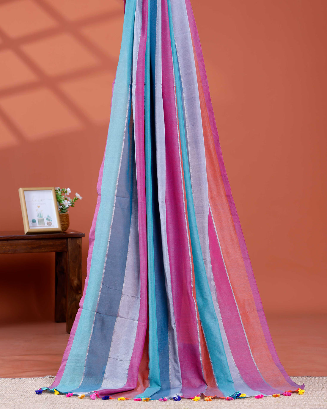 Handwoven Mul Mul Cotton Saree with Bold Striped Pattern and Tassel Detailing – Multi