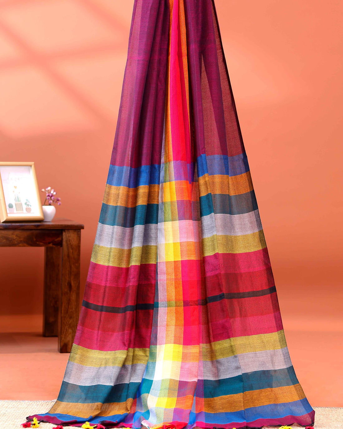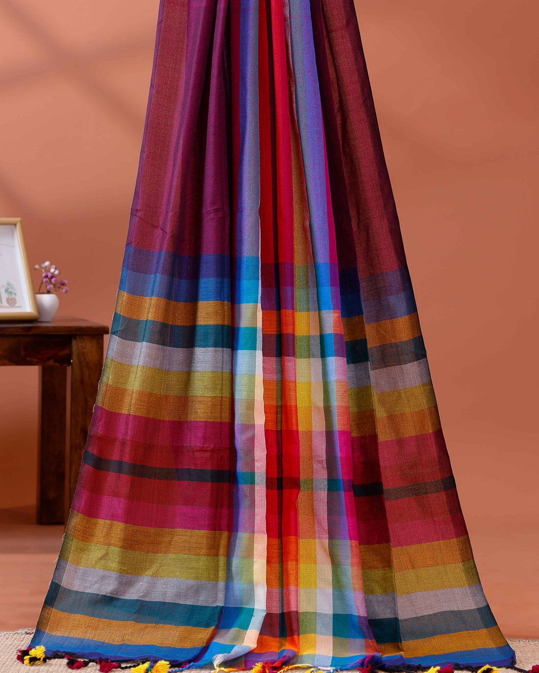 Handloom Mul Mul Cotton Saree with Vertical Stripe Pattern and Decorative Tassels - Dark Purple