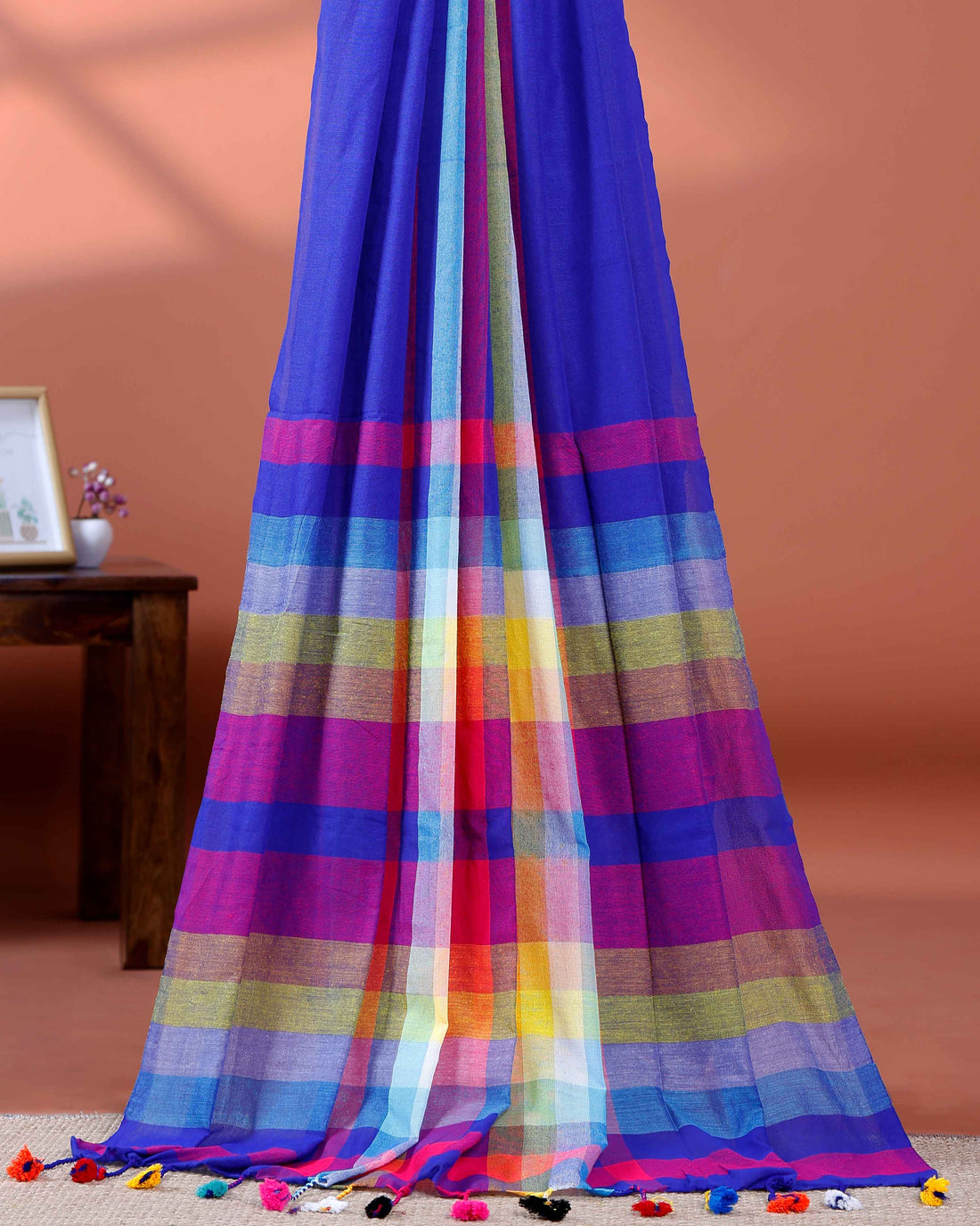 Handloom Mul Mul Cotton Saree with Vertical Stripe Pattern and Decorative Tassels -Blue
