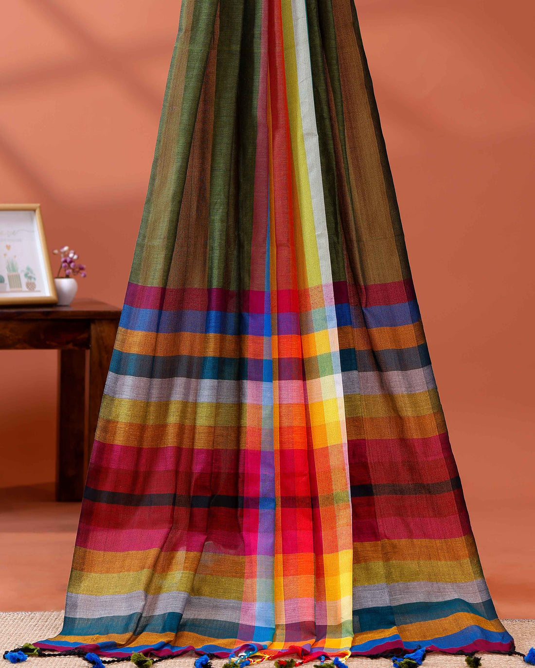 Handloom Mul Mul Cotton Saree with Vertical Stripe Pattern and Decorative Tassels - Dark Green