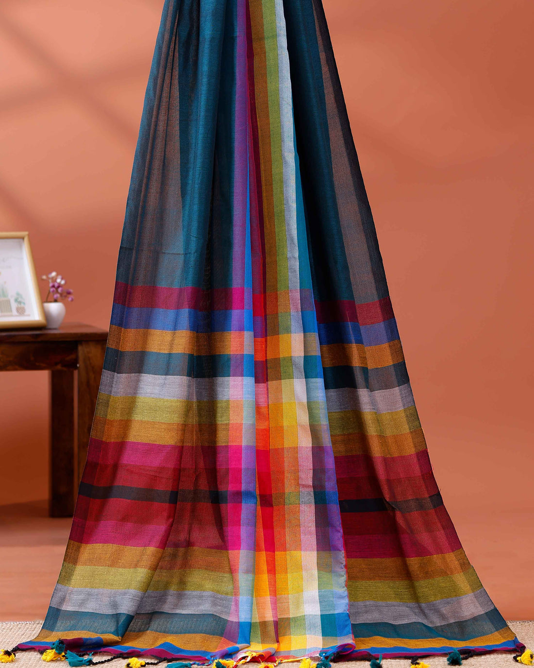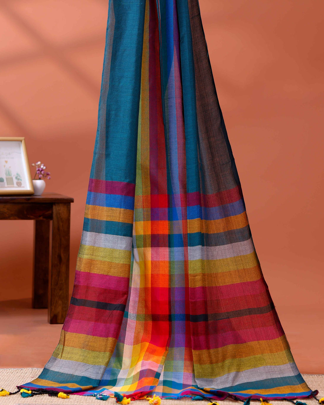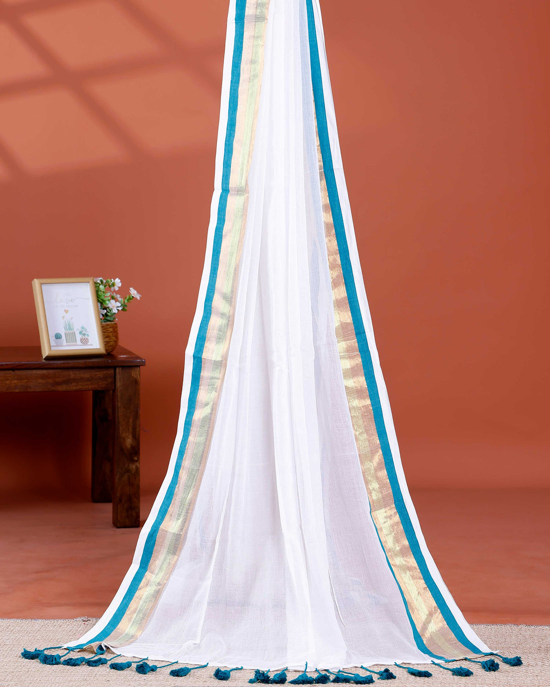 Handloom Mul Mul Cotton Saree with Vertical Stripe Pattern and Decorative Tassels - Teal
