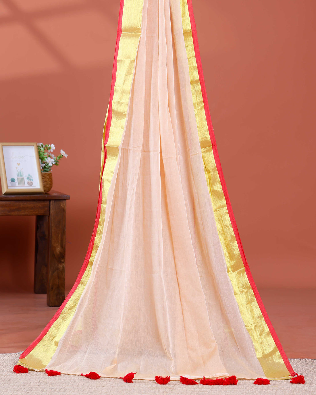 Handwoven Mul Mul Cotton Saree with Subtle Sheen and Contrasting Border – Peach