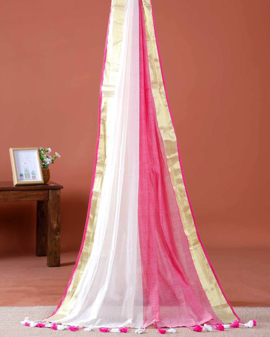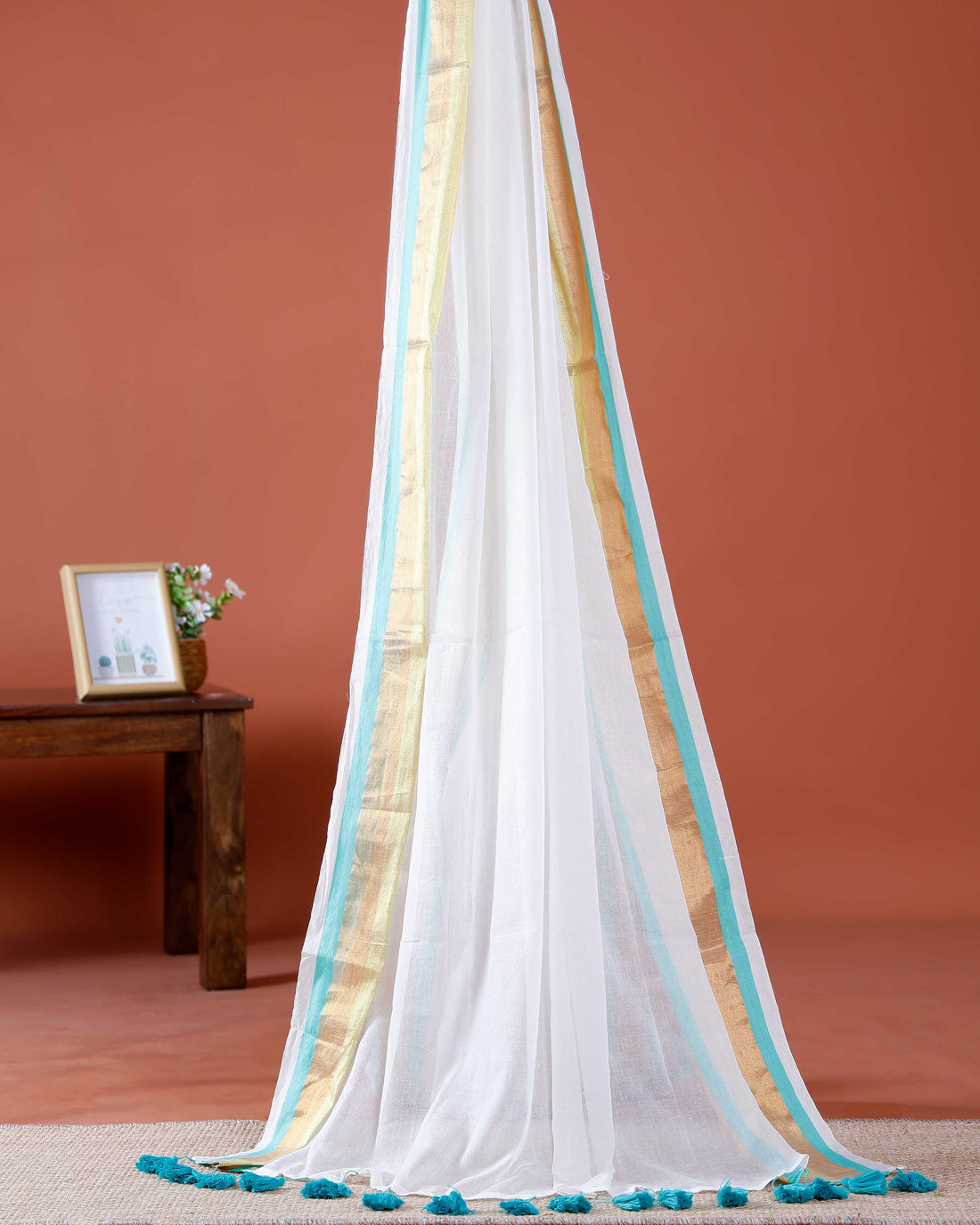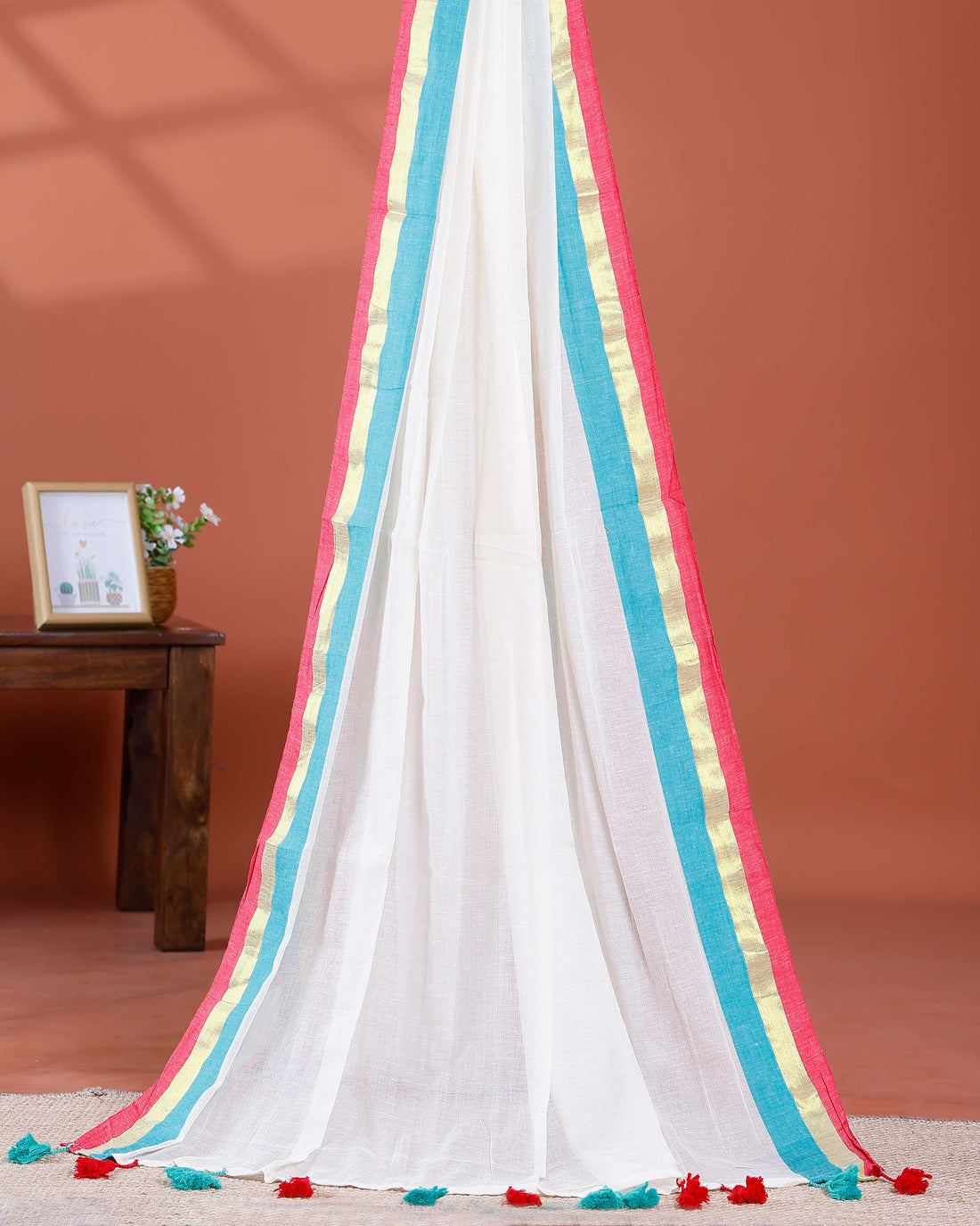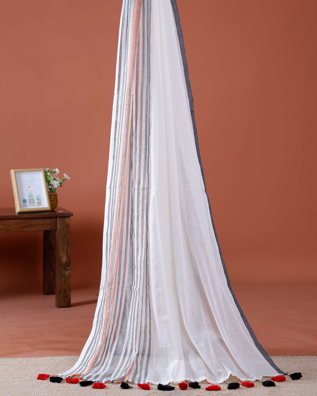 Handwoven Mul Mul Cotton Saree with Classic Striped Design and Colorful Tassel Accents – White