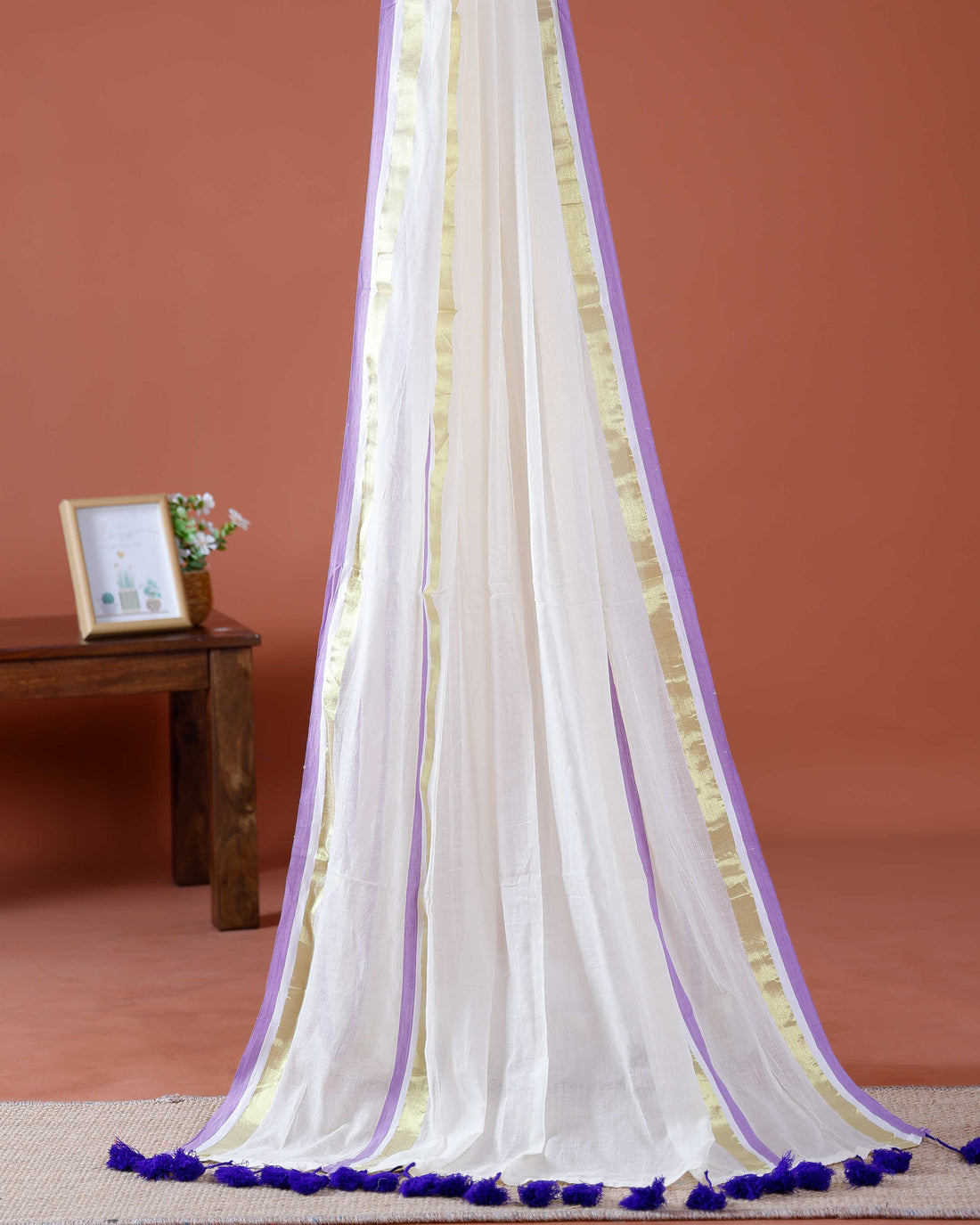 Handloom Mul Mul Cotton Saree with Vertical Stripe Pattern and Decorative Tassels - Purple