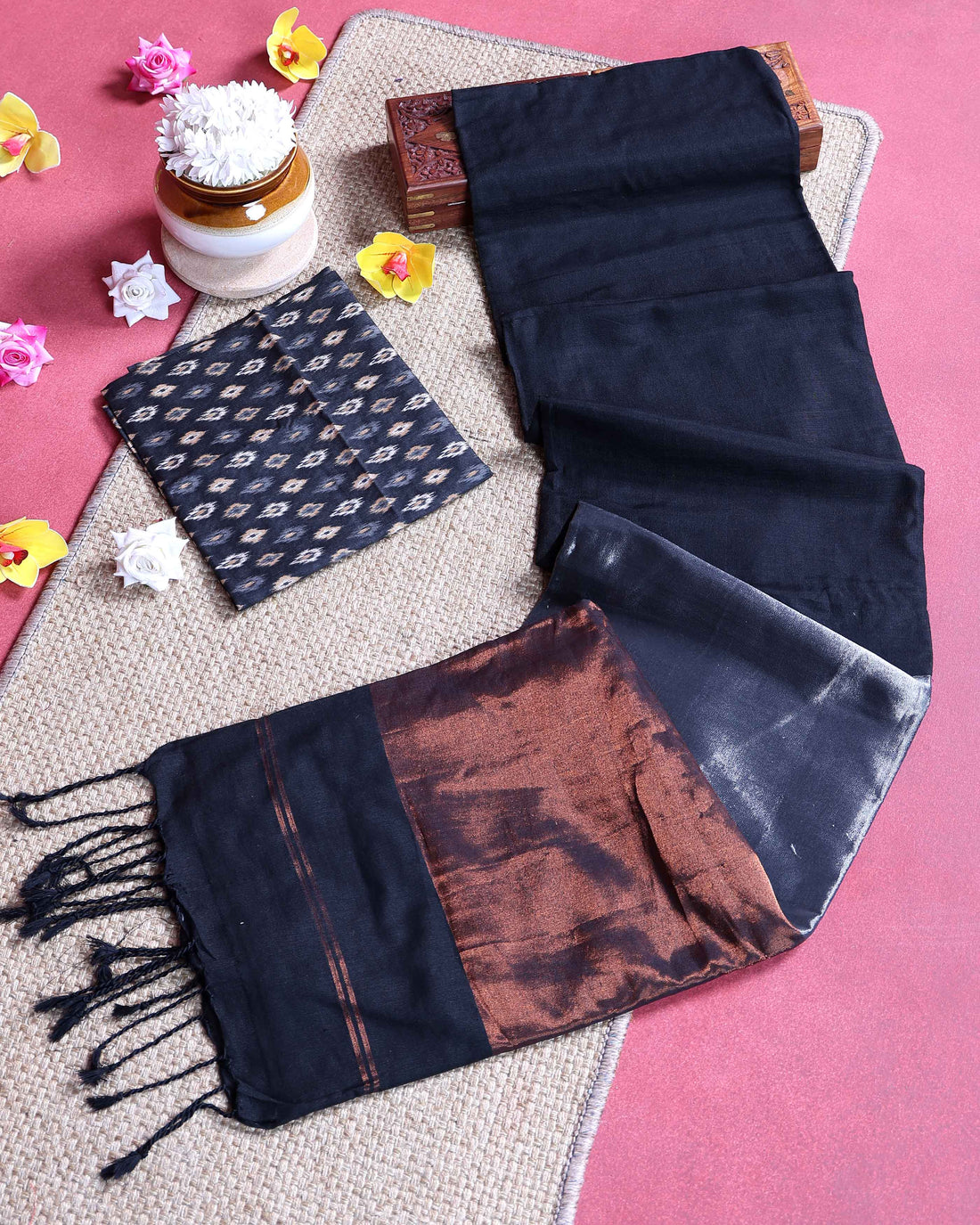 Traditional Khadi Cotton Saree with Woven Border and Contrast Printed Blouse Piece - Dark Brown