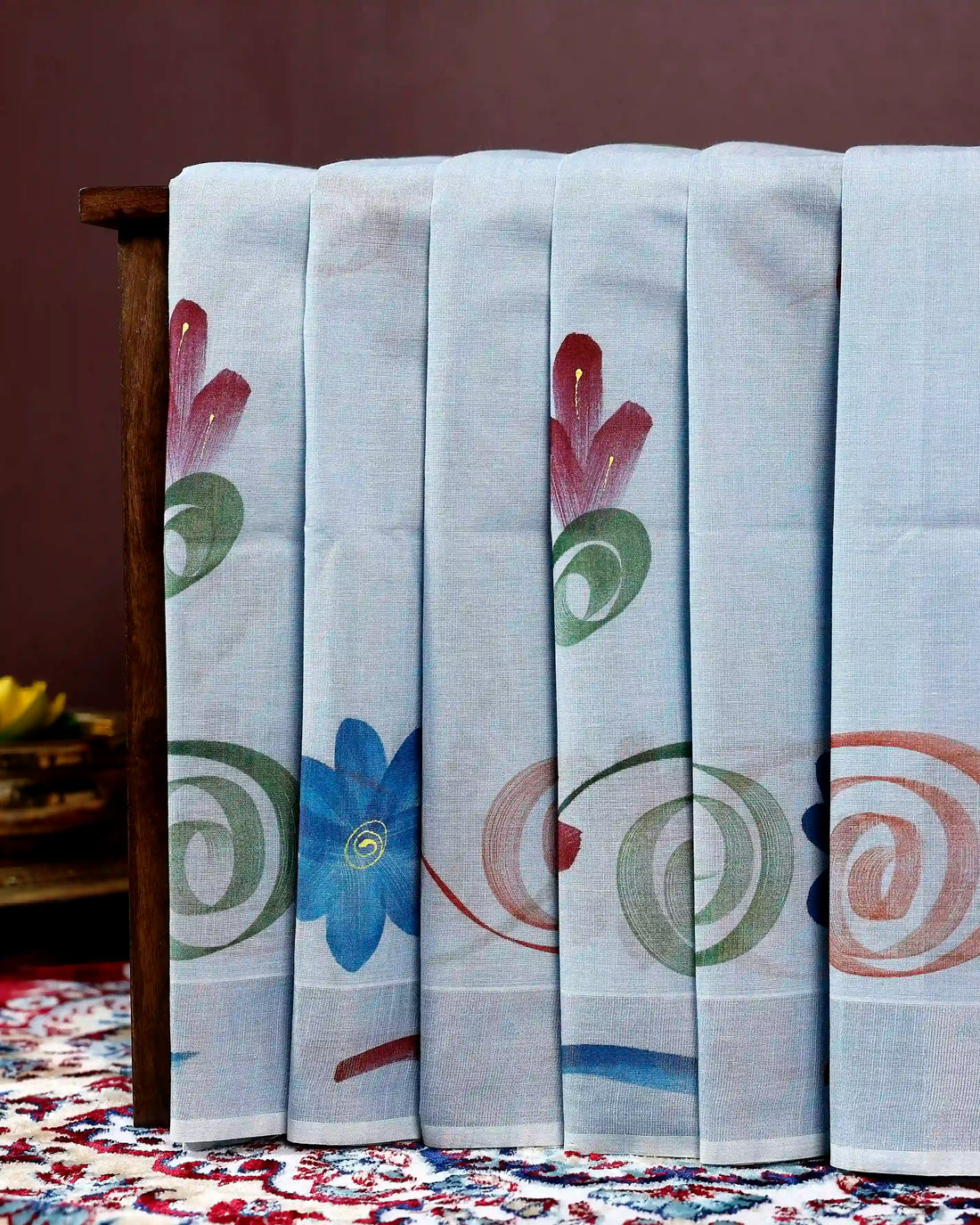 Handpainted Khadi Cotton Saree with Artistic Floral and Swirl Motif Design - Light Blue