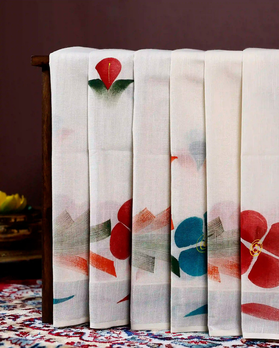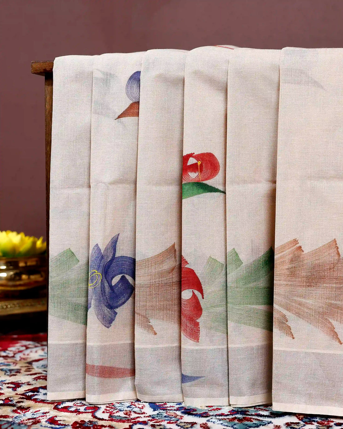 Handpainted Khadi Cotton Saree with Elegant Floral and Brushstroke Pattern - Cream