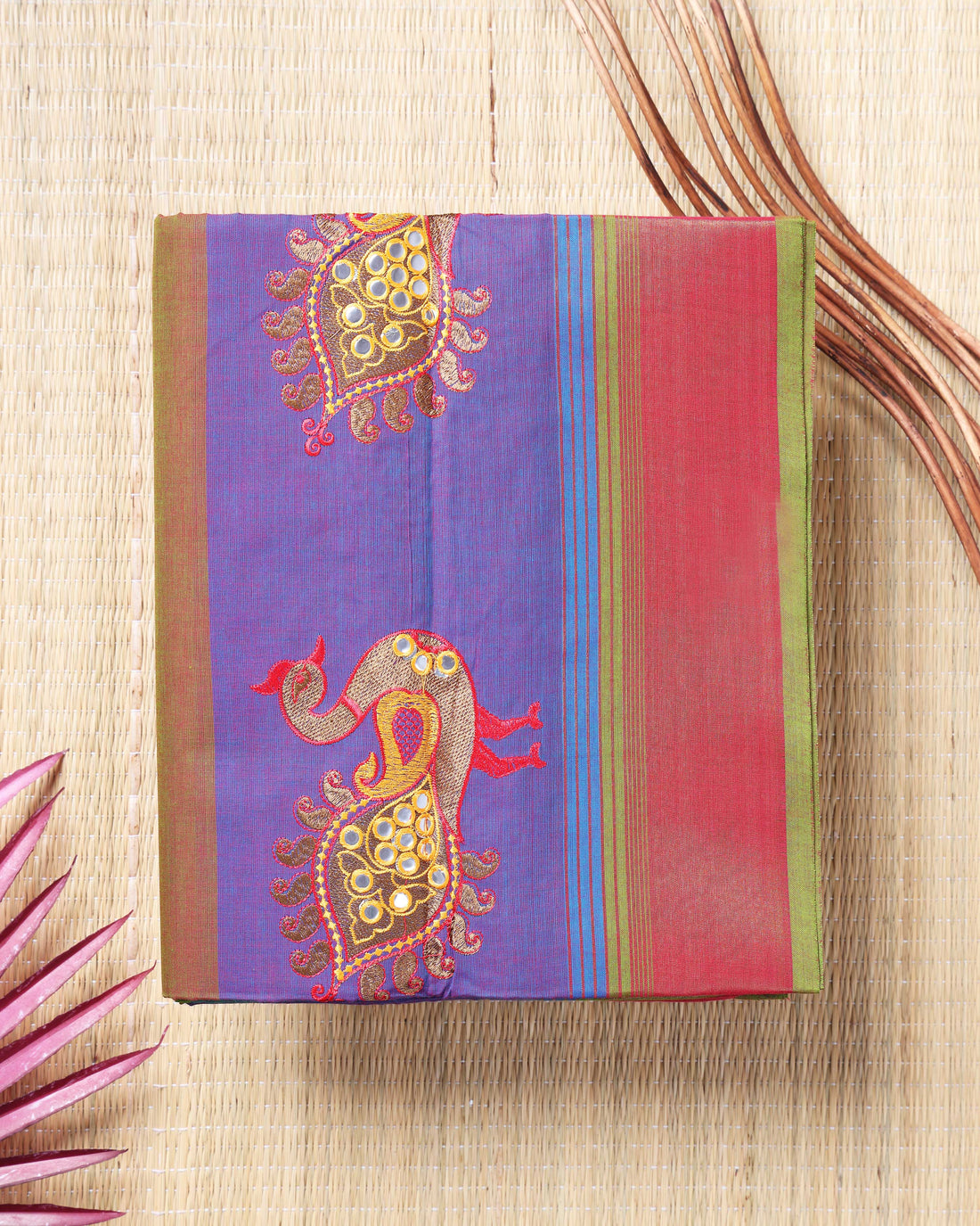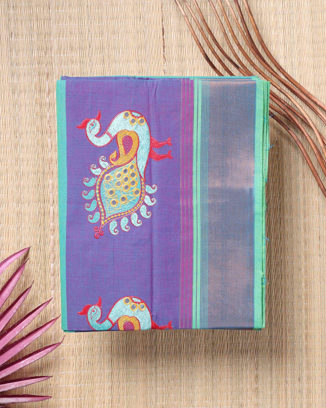 Handloom Cotton Saree with Peacock Embroidery - Double Shade