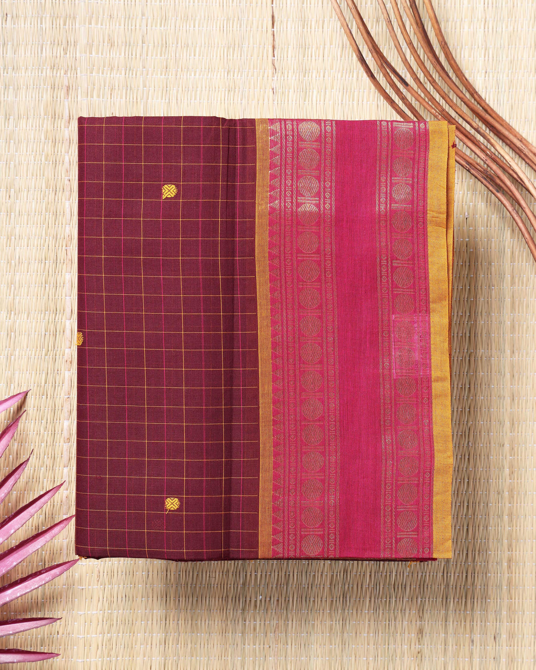 Handloom Cotton Saree with Checked Weave and Zari Border - Maroon