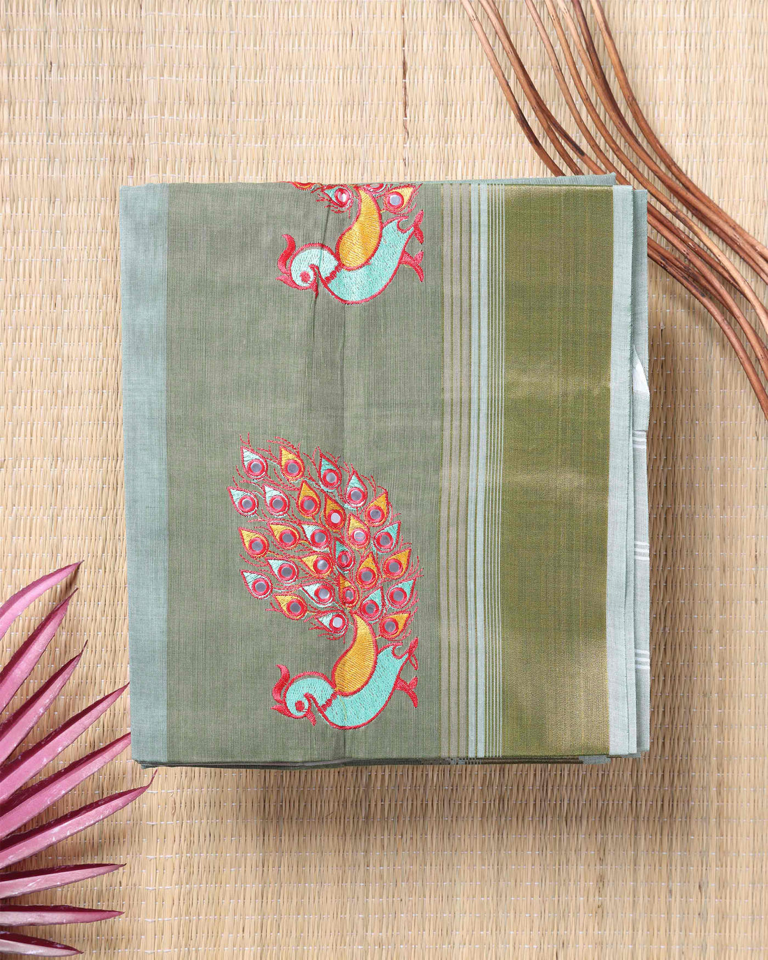 Handloom Cotton Saree with Peacock Embroidery - Green