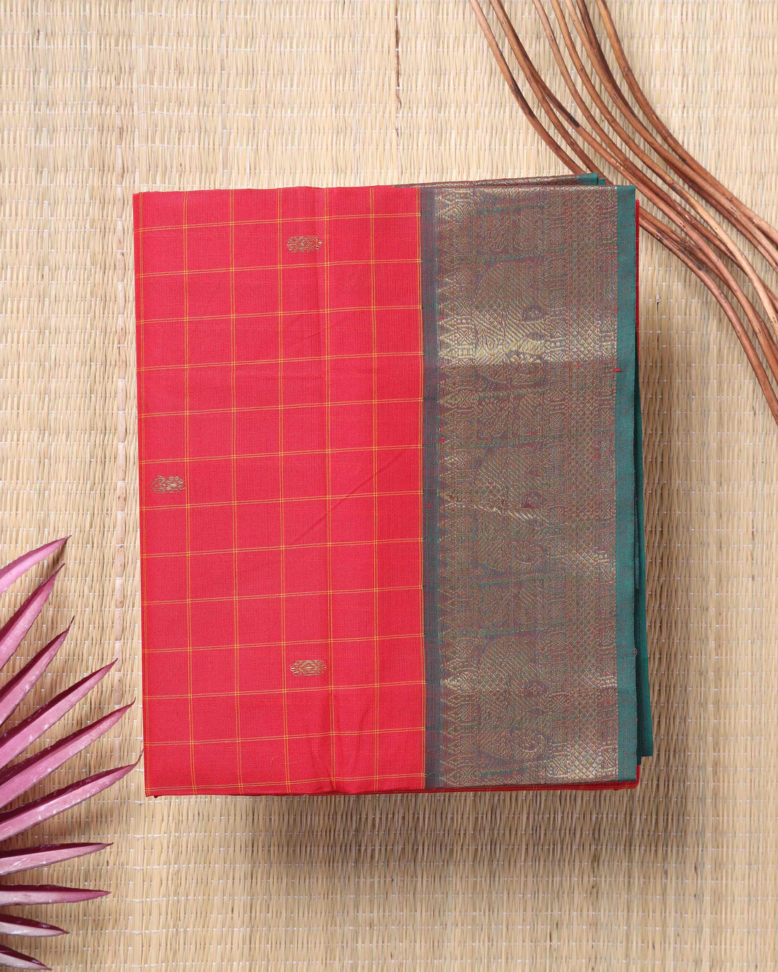 Handloom Cotton Saree with Checked Weave and Zari Border - Red