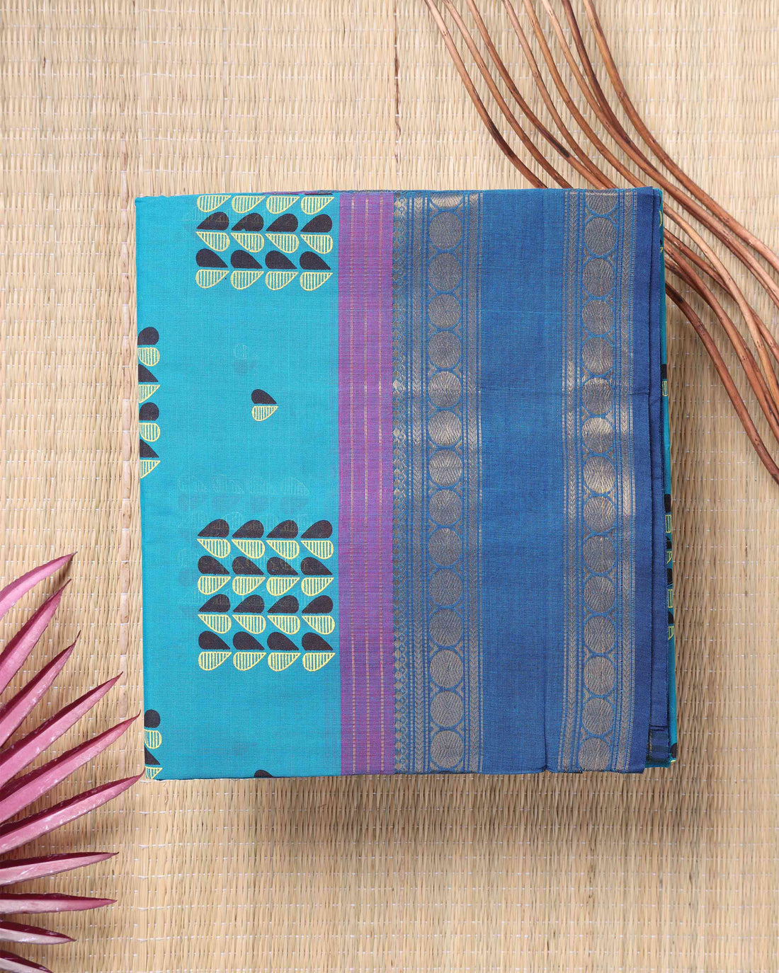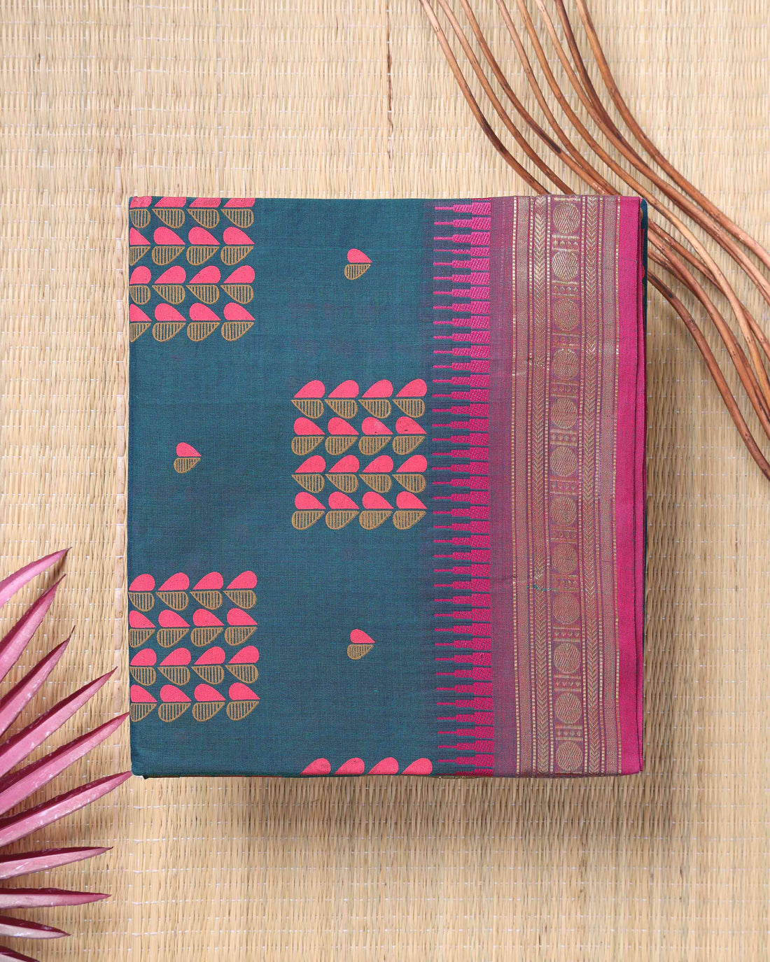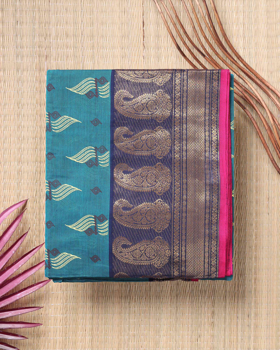 Traditional Handloom Cotton Saree with Geometric Weave - Teal